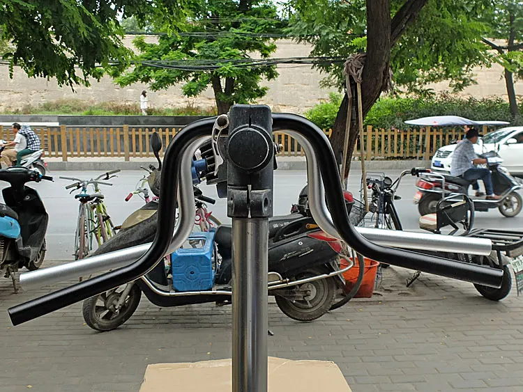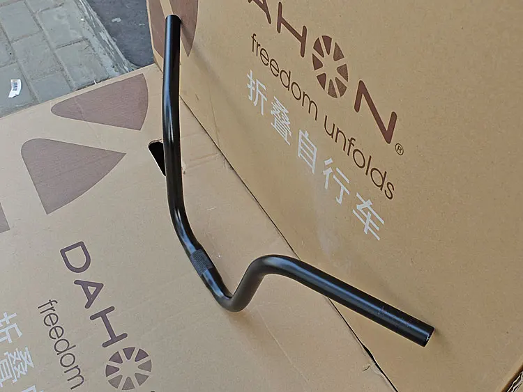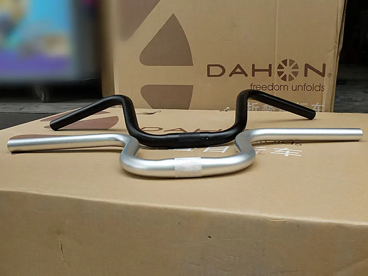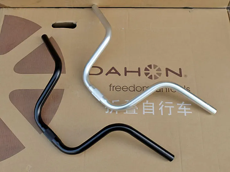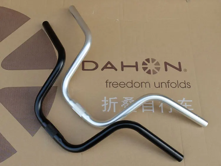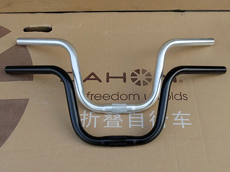 Manillares vintage Brompton, dos estilos, uno con un ángulo grande, el otro con casi ningún ángulo. Ambos estilos están disponibles en negro esmerilado y plata esmerilada.