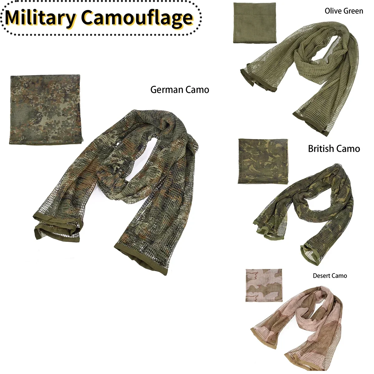 Scarf Cotton Camouflage Tactical Mesh Scarf Sniper Face Scarf Veil Camping Hunting Multi Purpose Hiking ScarveThis mesh scarf is used in all-weather, widely used in camouflage, defilading and protect yourself from blowing sand in outdoor or tactical activities.