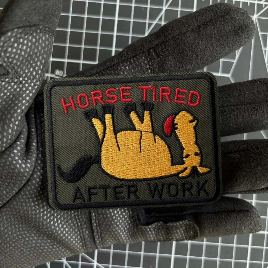 Los caballos están cansados del trabajo. Parches tácticos masculinos para ropa, parche bordado con gancho y bucle, pegatina para mochila militar