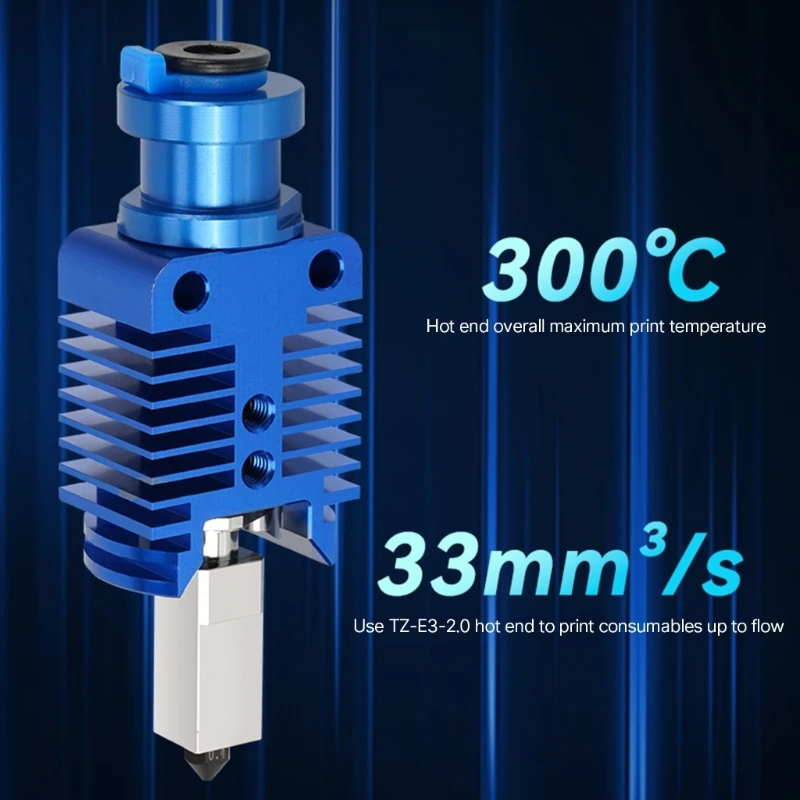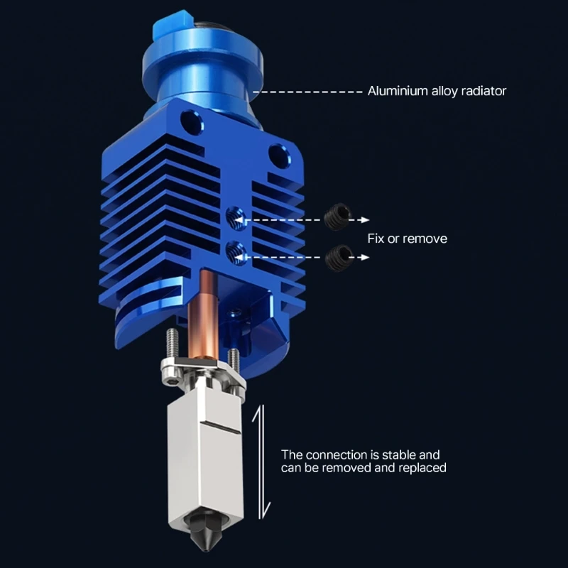 El bloque de calentamiento se actualiza con cromo circonio cobre niquelado para una rápida conducción de calor y resistencia a la impresión a altas temperaturas. La Garganta de aleación de titanio está envuelta con cromo circonio cobre para una mejor disipación del calor.