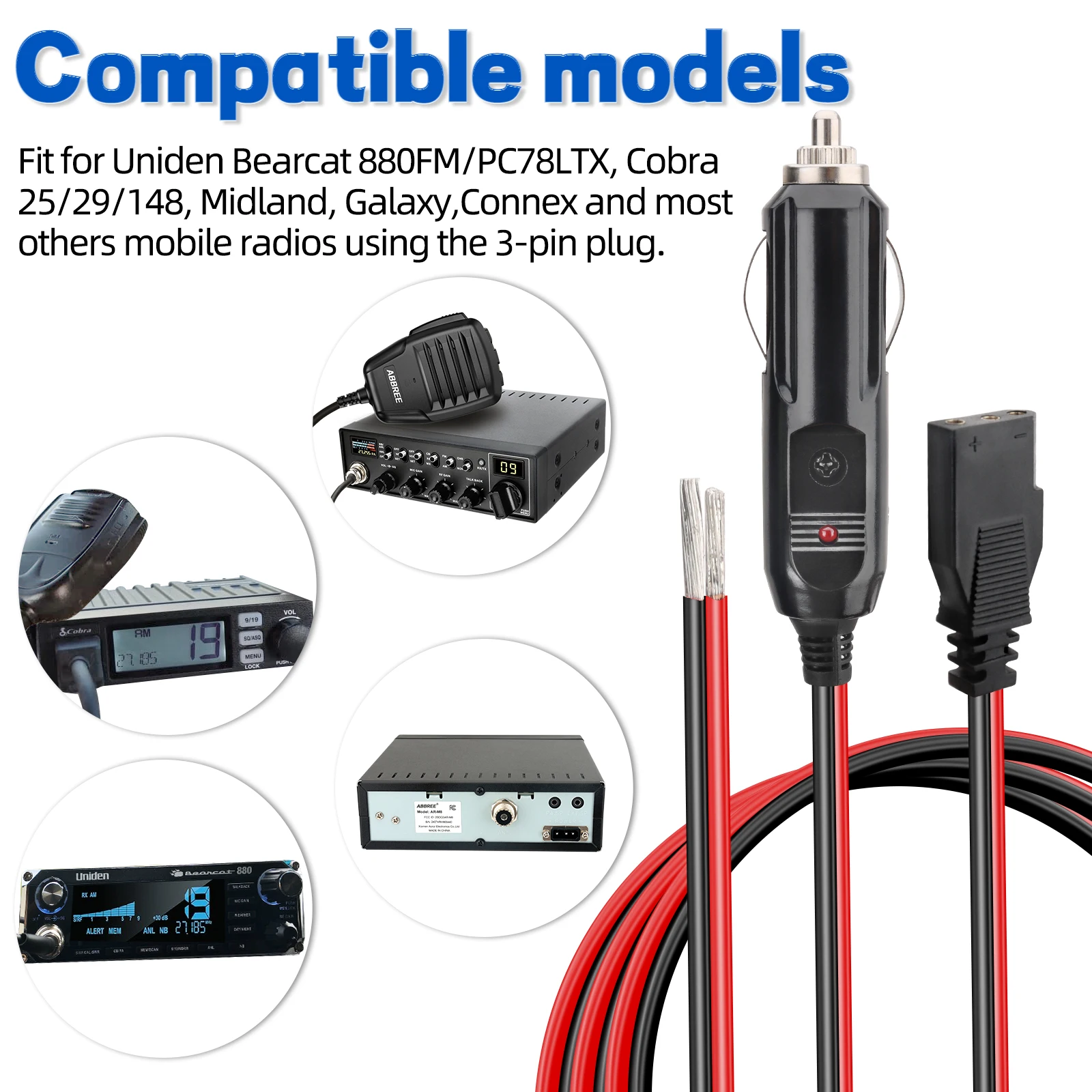 Apto para Uniden Bearcat 880FM/PC78LTX, Cobra 25/29/148, Midland, Galaxy, Connex y la mayoría de las radios móviles que utilizan el enchufe de 3 pines.