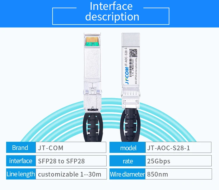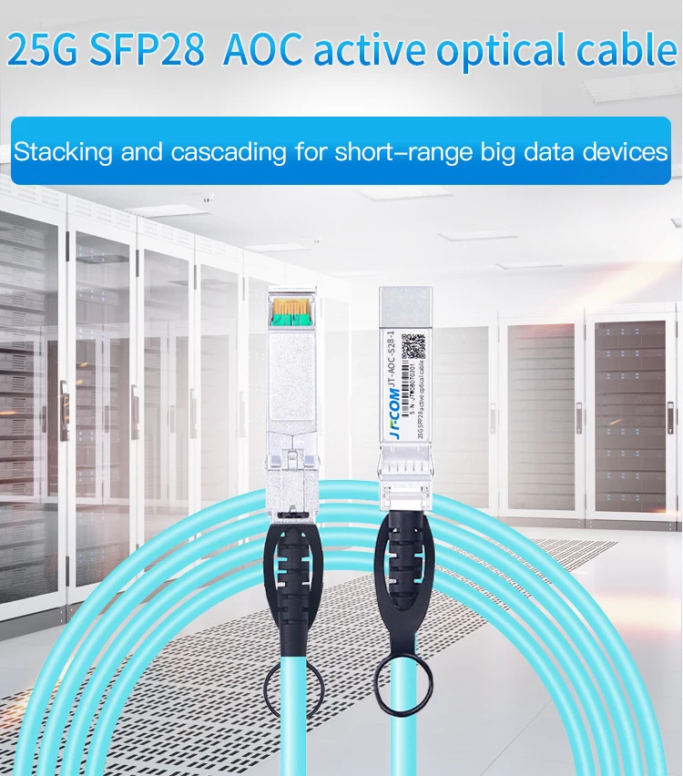 La familia de cables ópticos activos (AOC) SFP28 para aplicaciones Ethernet de 25Gb (25GbE) son los que se encuentran en la gama de productos de la serie 1 de 2. 1. Los cables 25G SFP + AOC proporcionan una solución alternativa ideal a los cables de cobre de conexión directa SFP28 (DAC) y la óptica del transceptor SFP28 de corto alcance. Están diseñados para alta velocidad, alta densidad y bajo consumo de energía para aplicaciones de redes de centros de datos.CaracterísticasVelocidad de transmisión de datos de hasta 25,3 Gbit/s