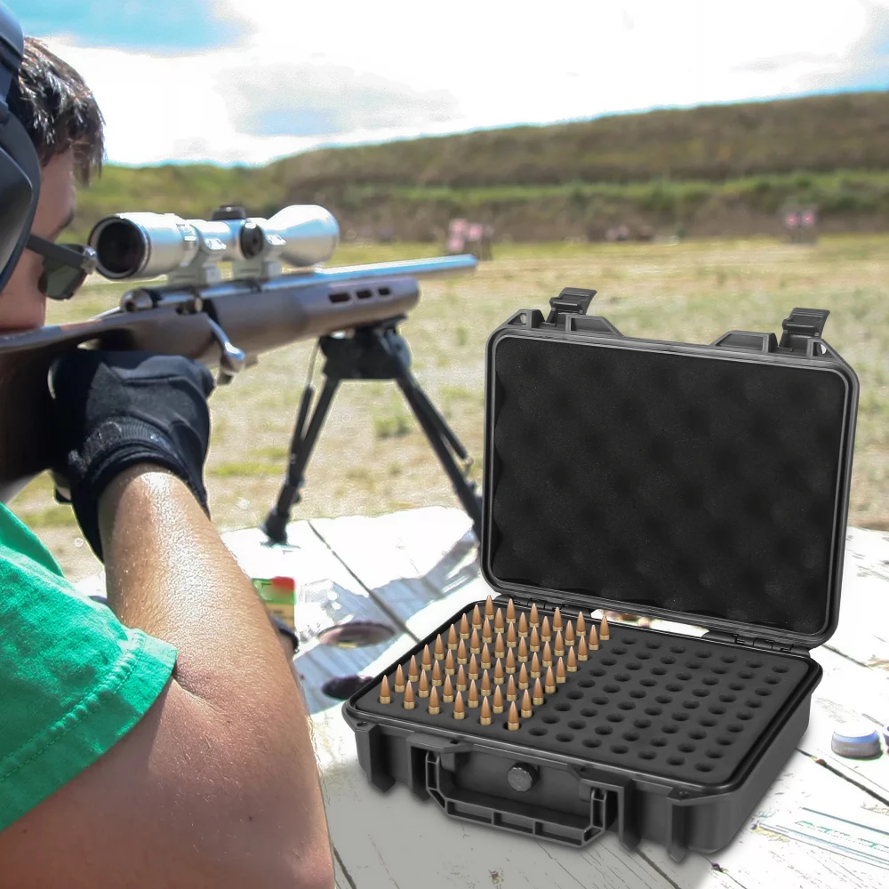 Nuestro estuche de almacenamiento de munición ofrece protección impermeable y a prueba de golpes para sus valiosas balas, capaz de soportar una inmersión de hasta 1 metro.