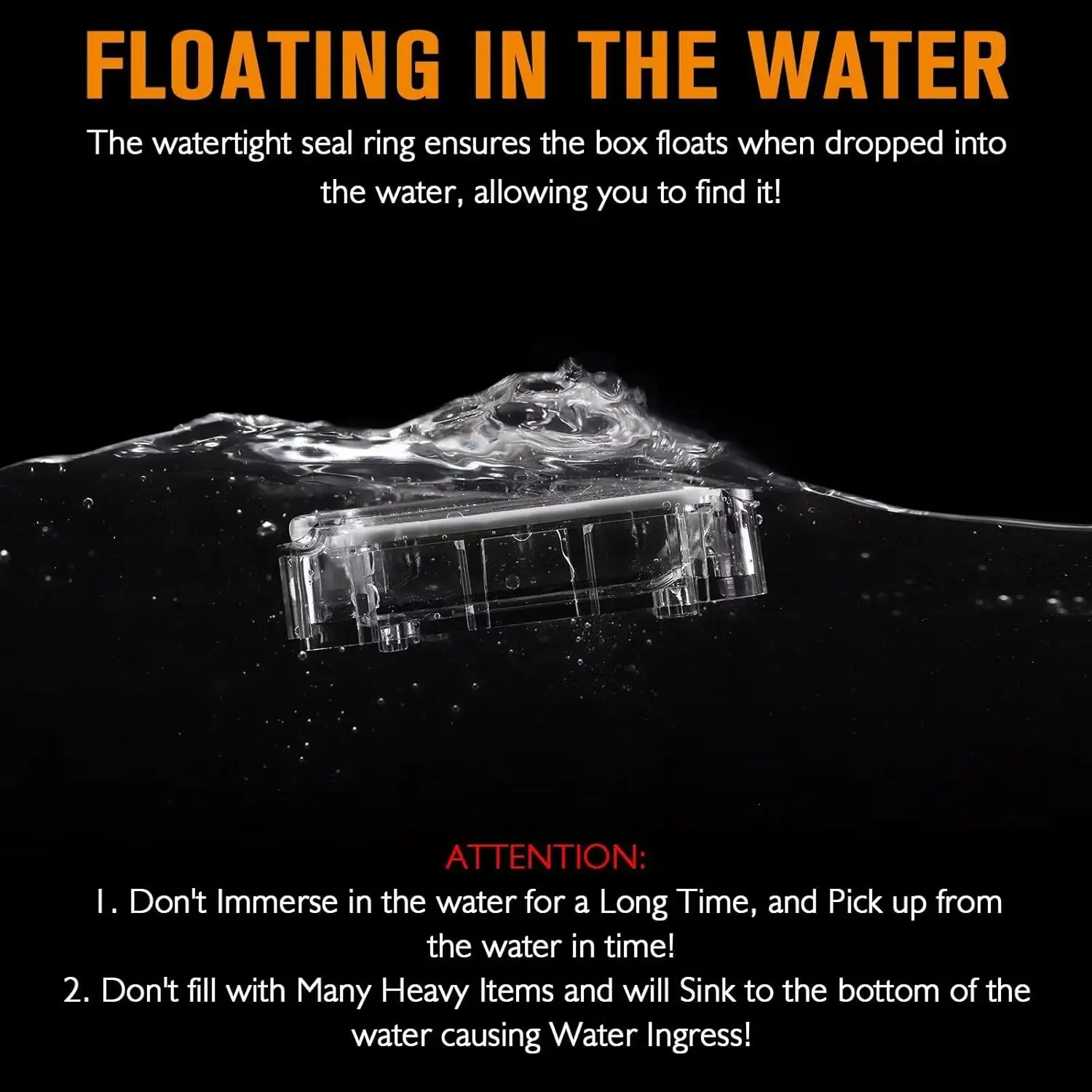 5. 【ANEL DE SELLADO DE AGUA VERSÁTIL】 Cada pequeña caja de aparejos de pesca tiene un anillo de sellado hermético alrededor de los bordes para mantener la caja hermética y la caja flotará si se cae al agua.El sello hermético también brilla en la oscuridad para acceder fácilmente a los accesorios cuando se pesca de noche.ATENCIÓN: 1. ¡No lo sumerjas en el agua durante mucho tiempo y recoges del agua a tiempo!2. ¡SINK en la parte inferior cuando se llena con muchos elementos pesados como plomos, giratorios, plantillas y provocar la entrada de agua!