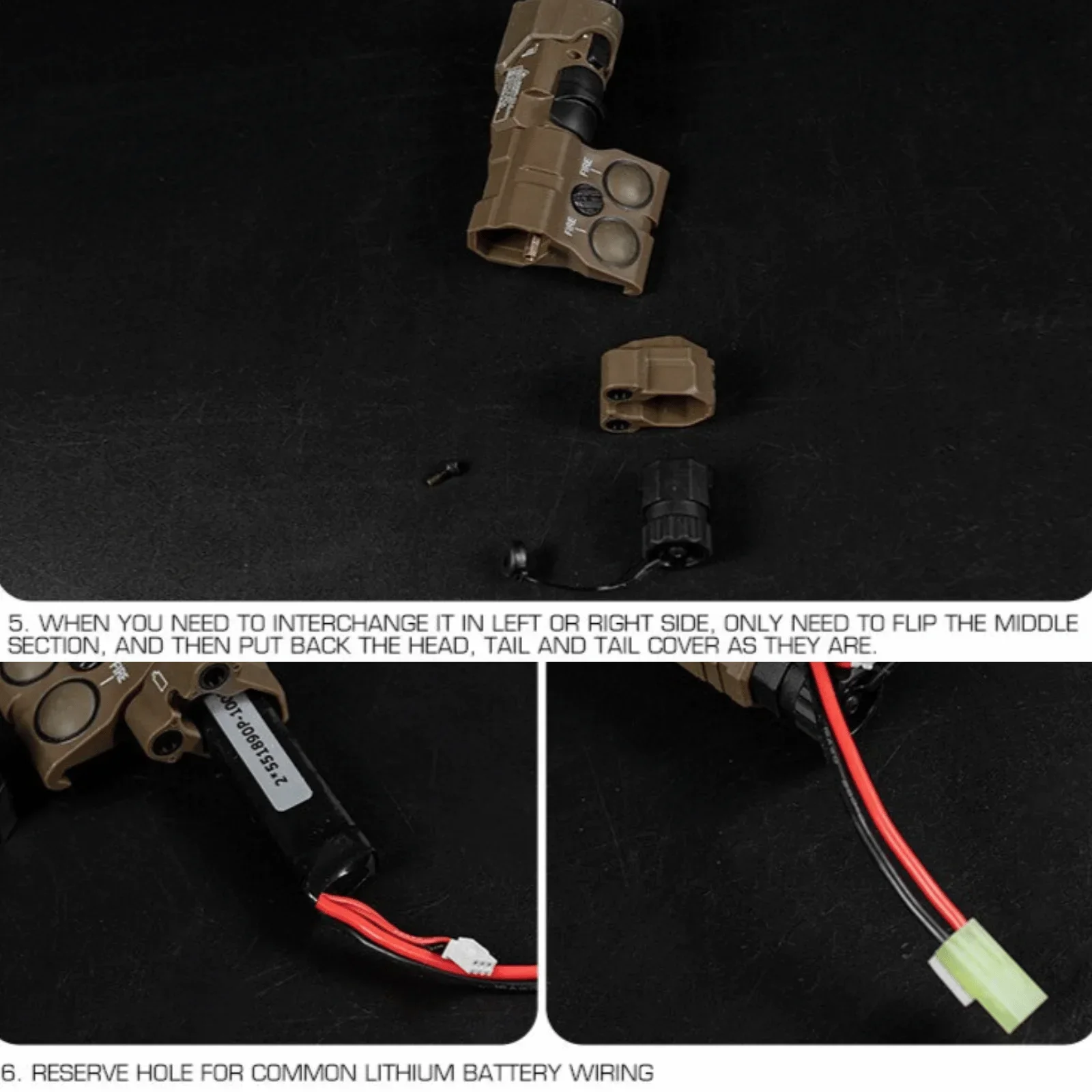 5.Cuando necesite intercambiarlo en el lado izquierdo o derecho, solo necesita girar la selección del medio y luego volver a colocar la cubierta de la cabeza, la cola y la cola como están.