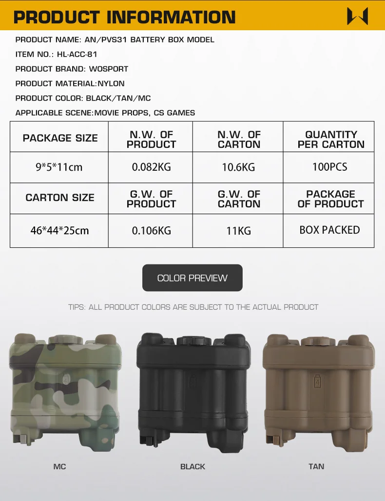 Caja de batería táctica NVG AN/PVS-31, modelo simulado, sin función, funda de visión nocturna, caza, tiro, casco Airsoft, accesorios