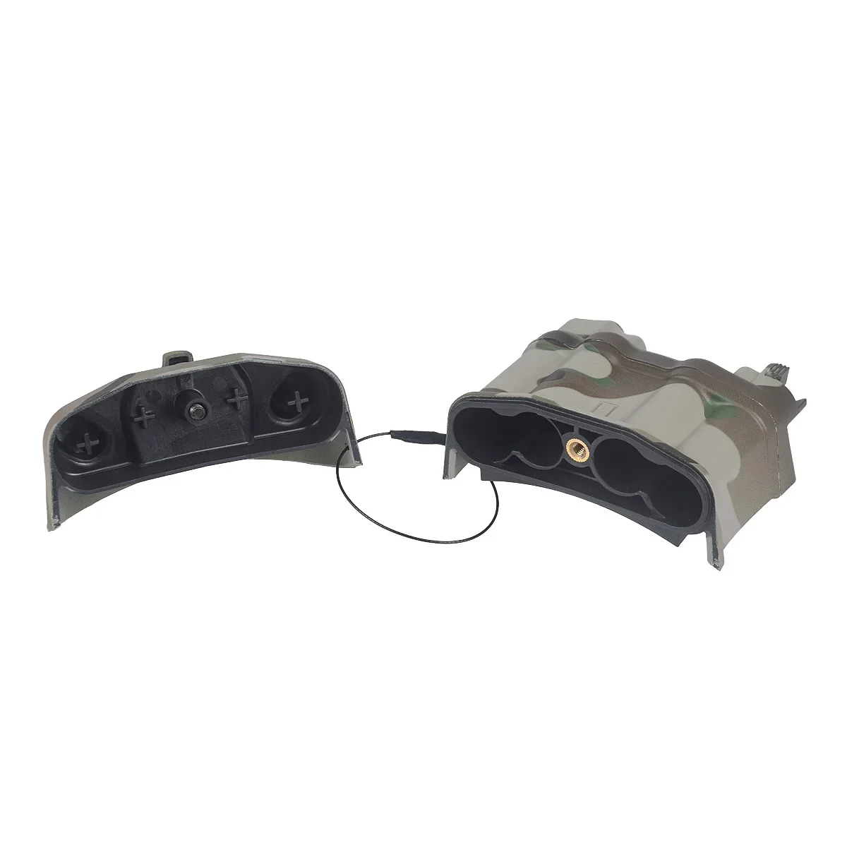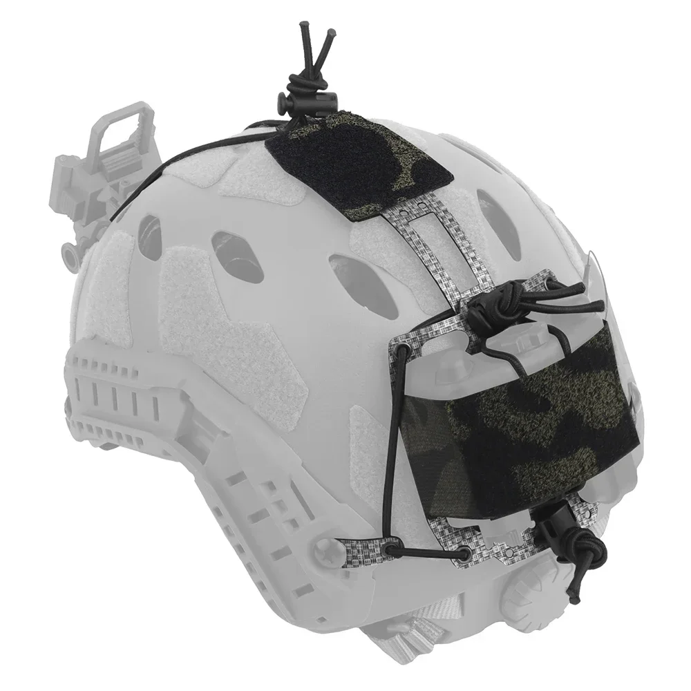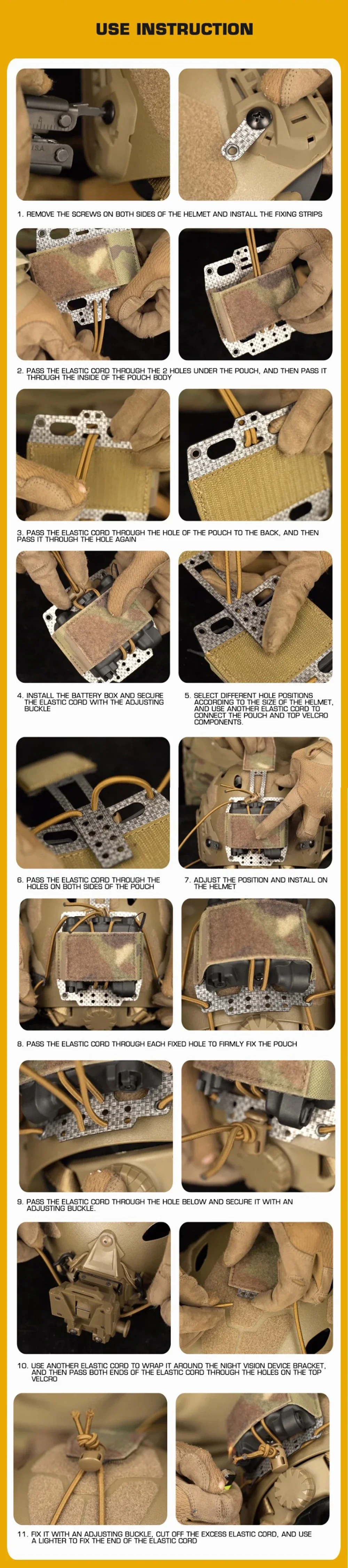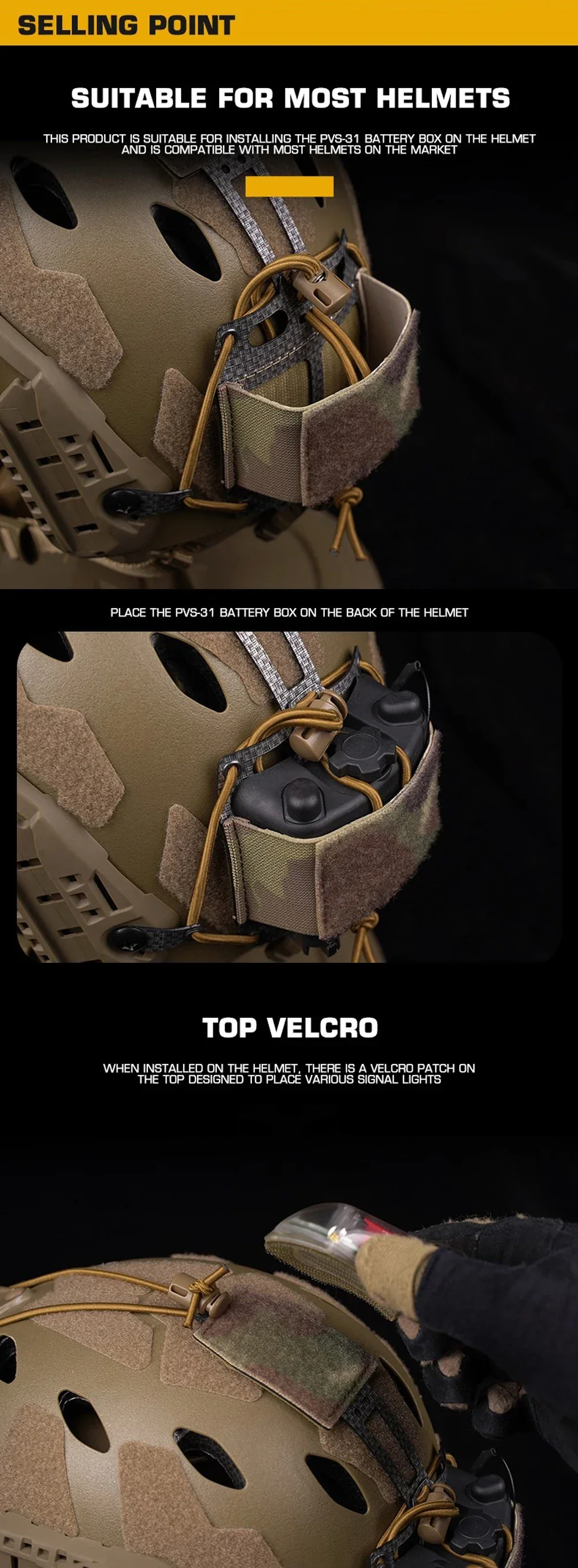 El paquete de baterías se sujeta en una funda que se fija al casco con velcro.Dos anclajes laterales se fijan al casco con pernos de la correa de la barbilla o mediante rieles accesorios.El tercer anclaje opcional es un puente firme a un soporte estroboscópico IR que se puede ajustar y fijar en la parte superior del casco con velcro.