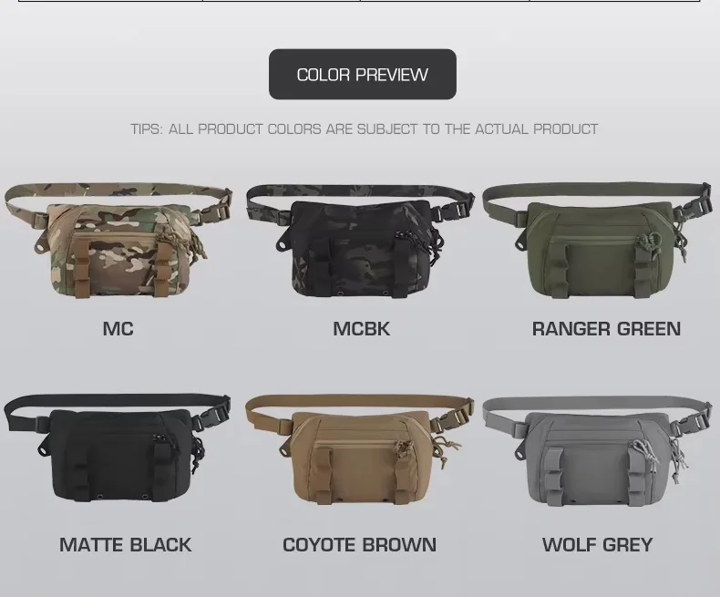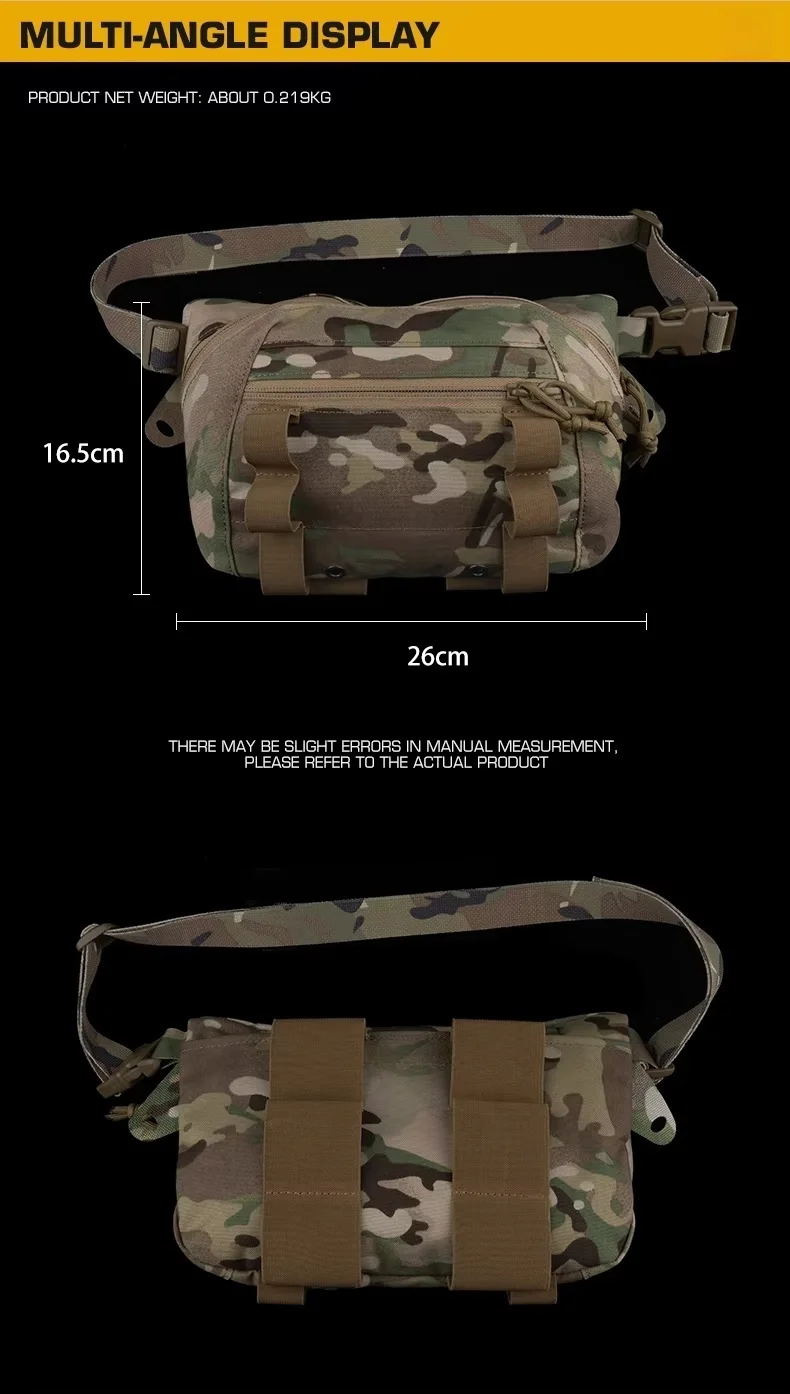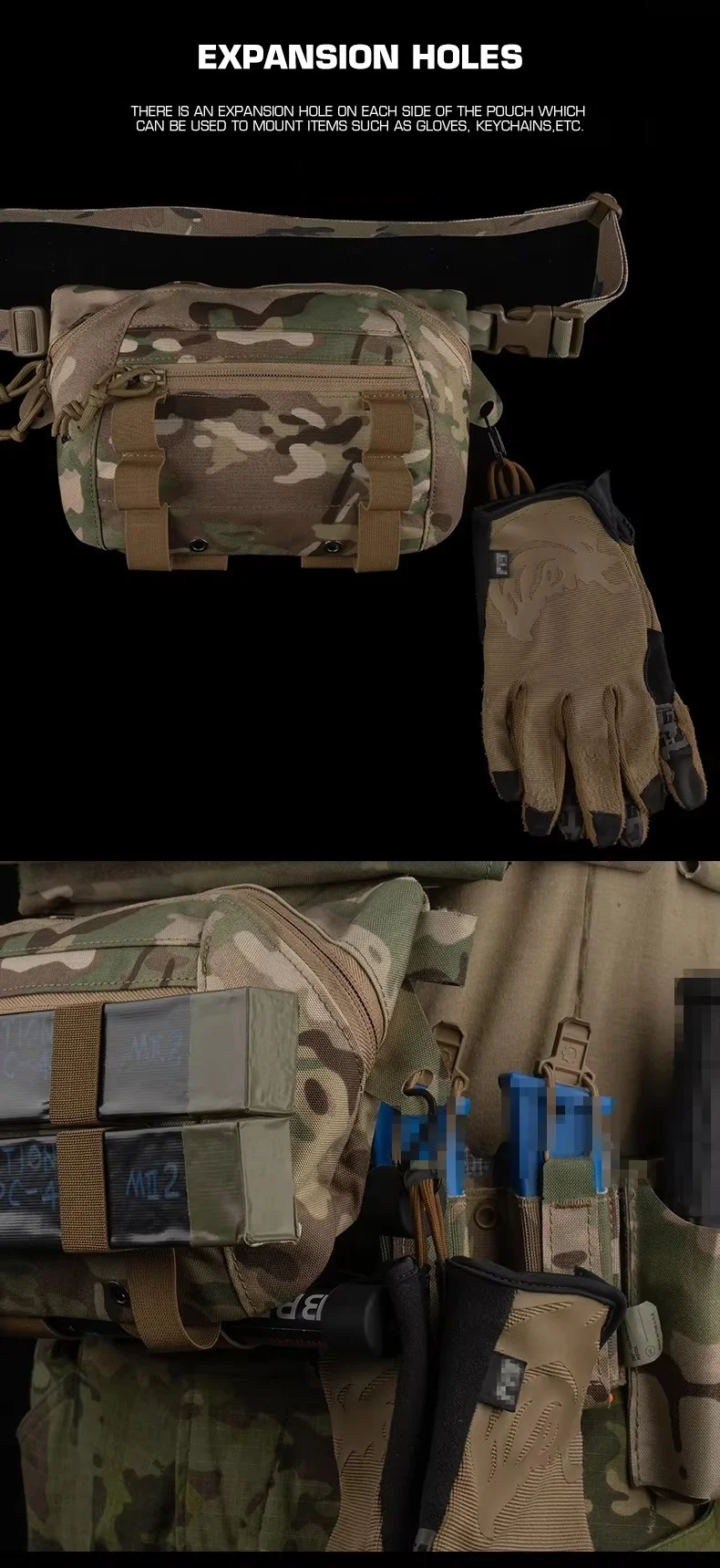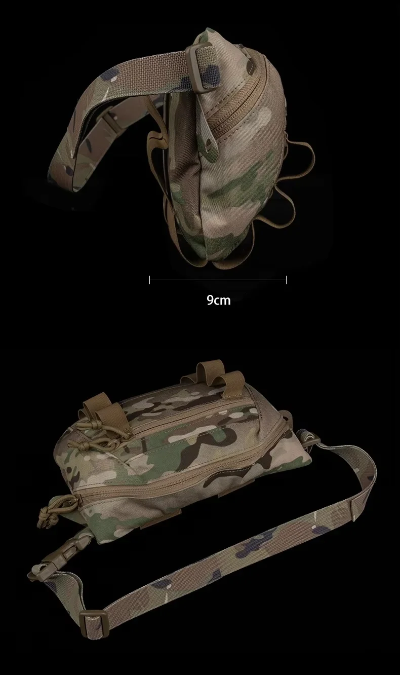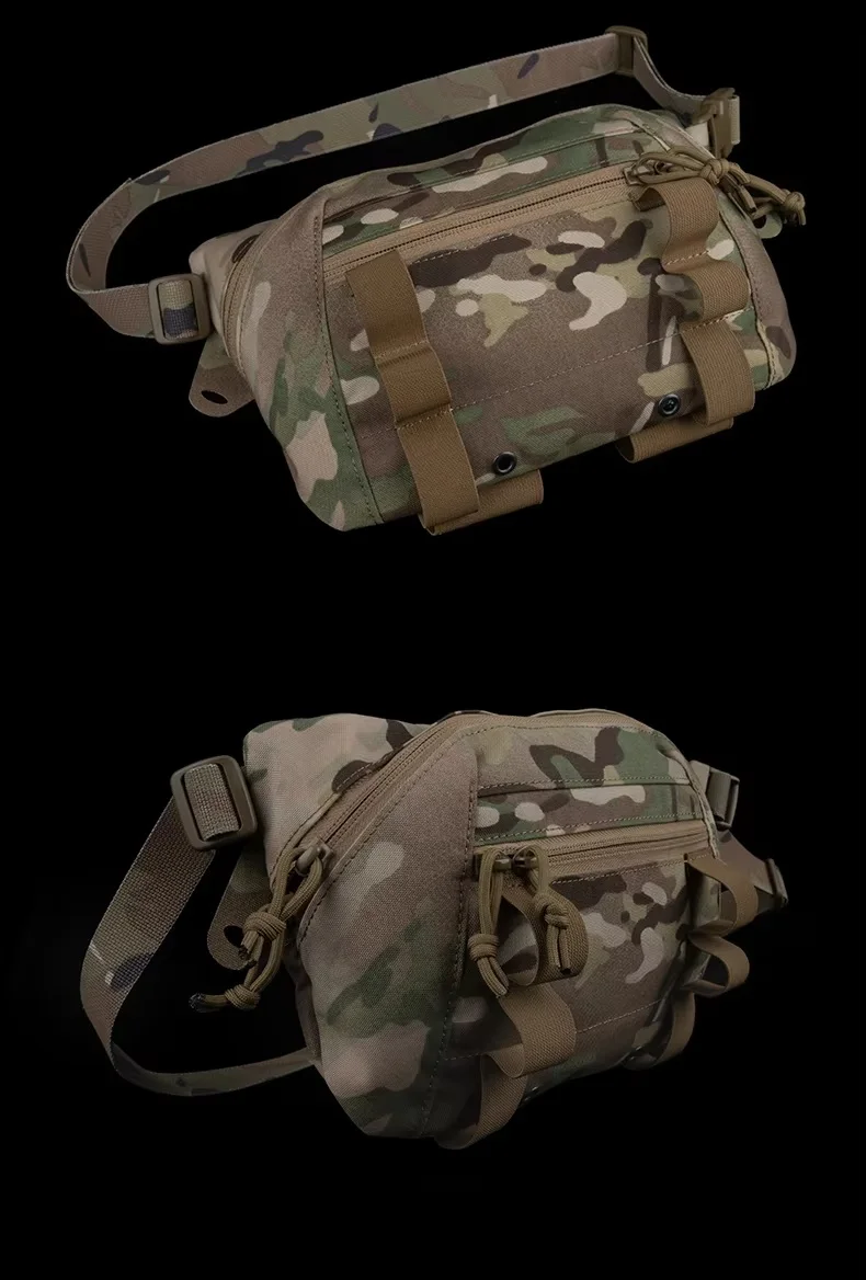 1. Riñonera táctica de tamaño mediano:Llena el espacio entre bolsas más pequeñas y más grandes, optimizadas para papeles tácticos/respetuosos.Cuenta con un compartimento principal contorneado con "media cremallera".