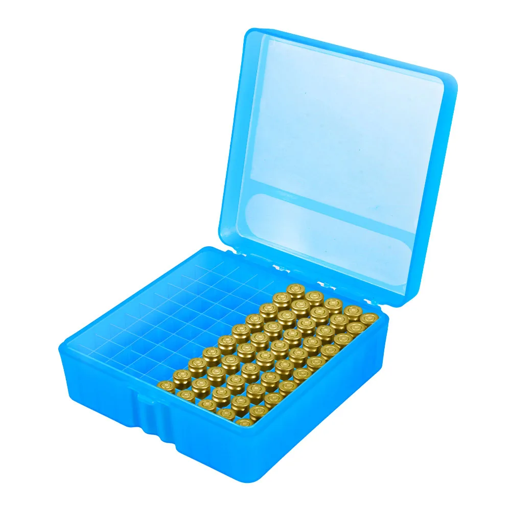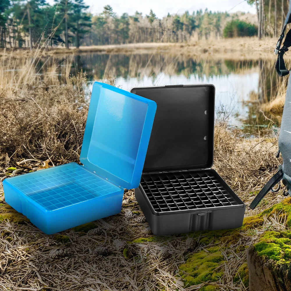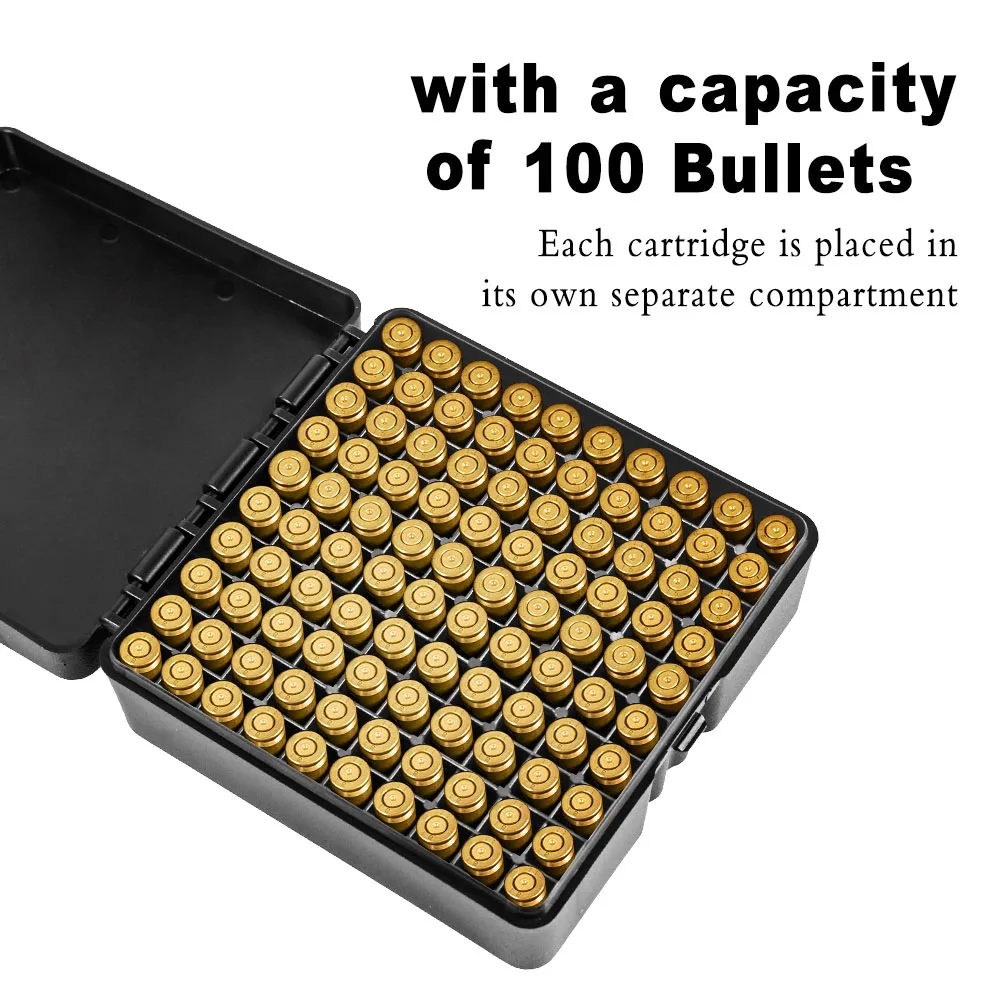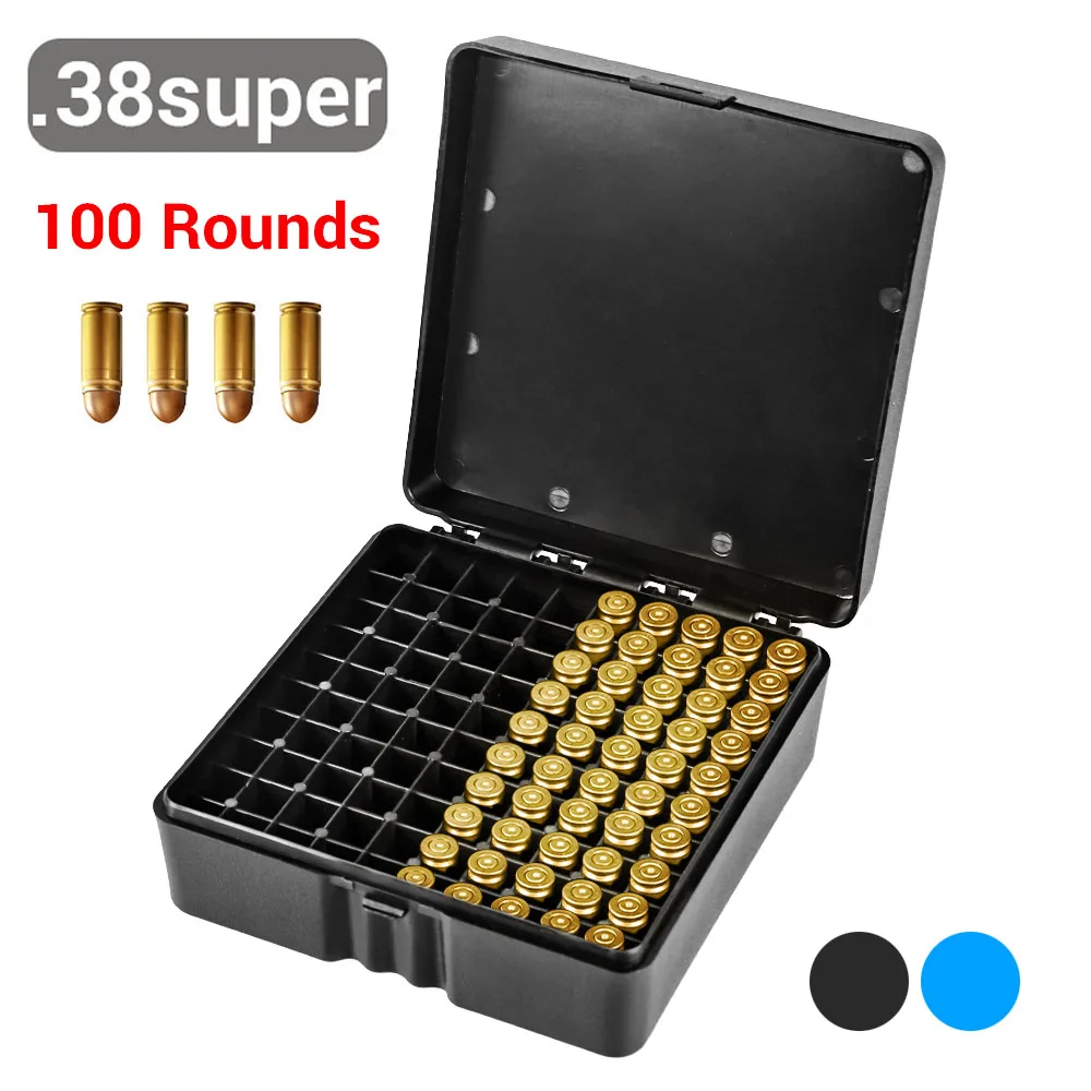 Caja de munición de 100 rondas.38super Bullet Shell Holder Box Caso de munición Pistola Rifle Ammo Carry Caja de almacenamiento Flip-Top Bullets Case