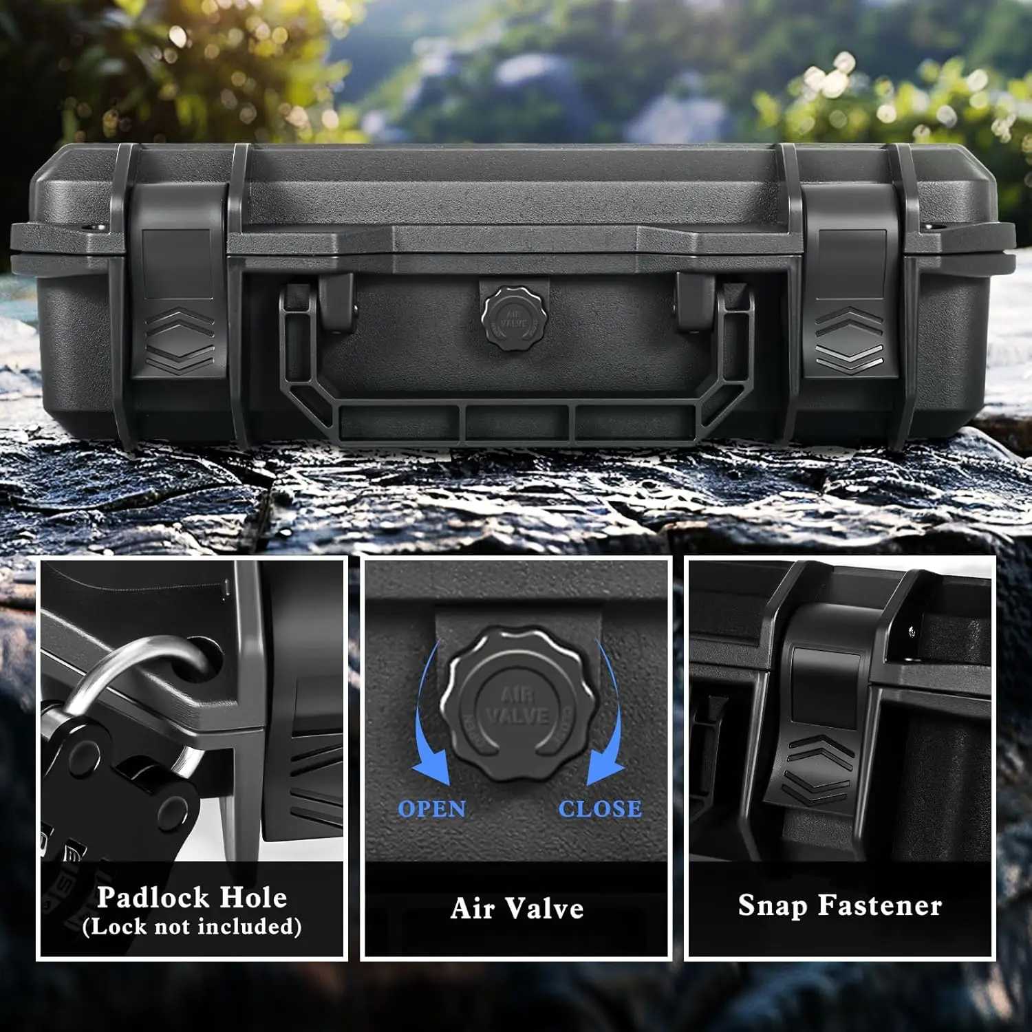 5. 【Sistema de bloqueo seguro】 Equipado con un pestillo de bloqueo integrado compatible con candados estándar, este estuche evita el acceso accidental por parte de niños o robos.