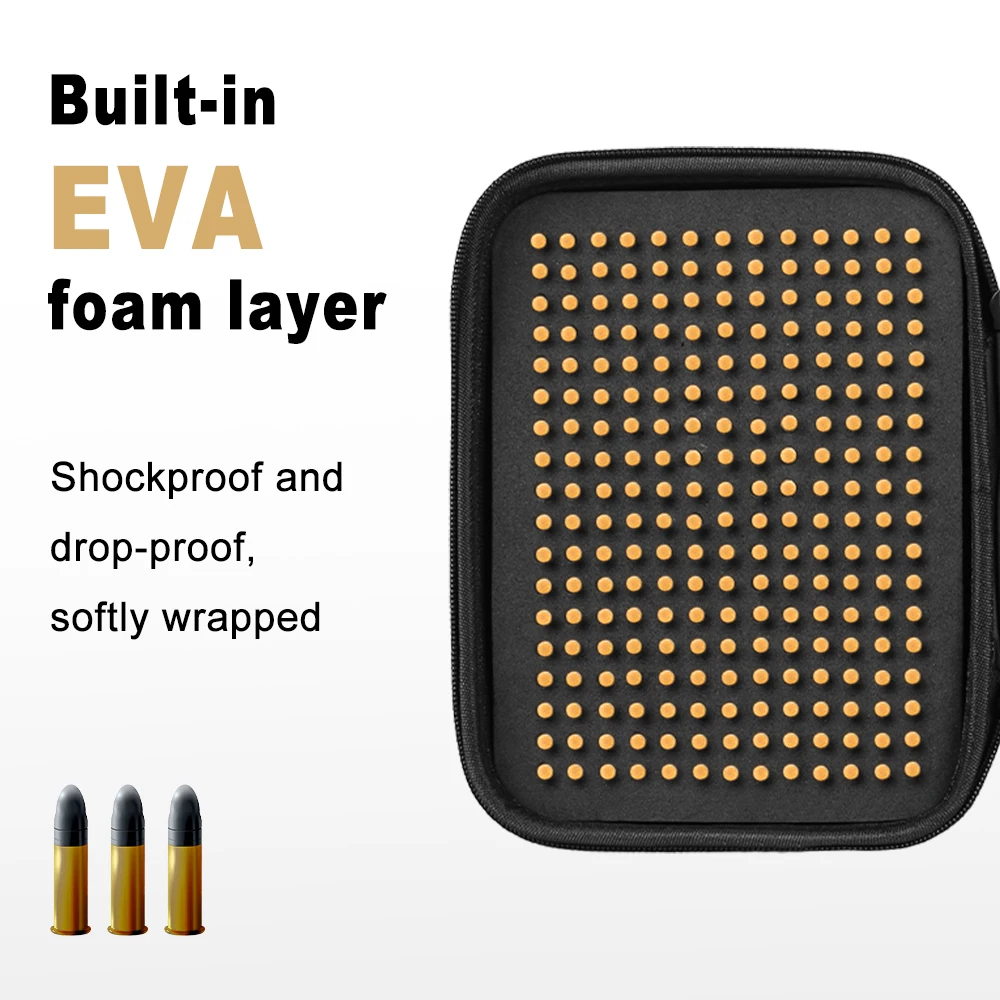 1. 【Alta calidad】 Esta bolsa de munición está hecha de tela Oxford de alta calidad + material EVA + capa de espuma incorporada, resistente y duradera.Es a prueba de golpes y caídas, lo que proporciona la máxima protección contra impactos para las balas. Modelos aplicables a municiones:.22LR.