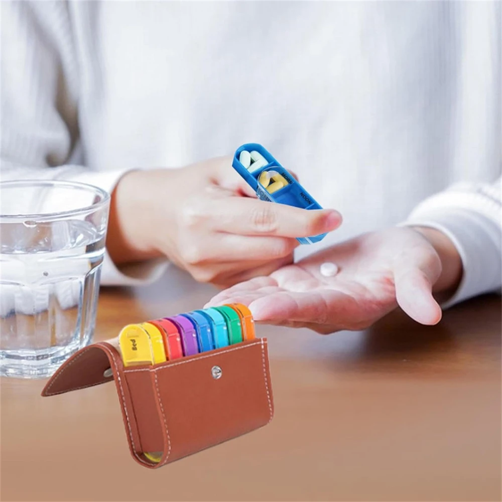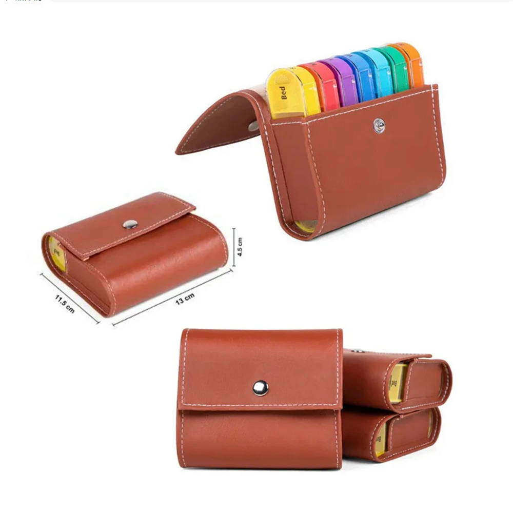 Caja organizadora de pastillas semanal, recordatorio de medicación de viaje diario, estuche de transporte de cuero con 7 compartimentos