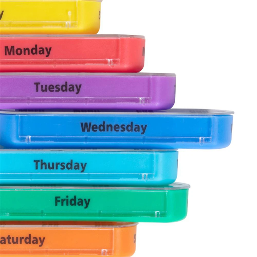 El pastillero está diseñado con 7 compartimentos grandes y se puede utilizar como pastillero semanal de 1 a 7 días.Cada compartimento grande está dividido en 4 rejillas que pueden contener medicamentos cuatro veces al día.