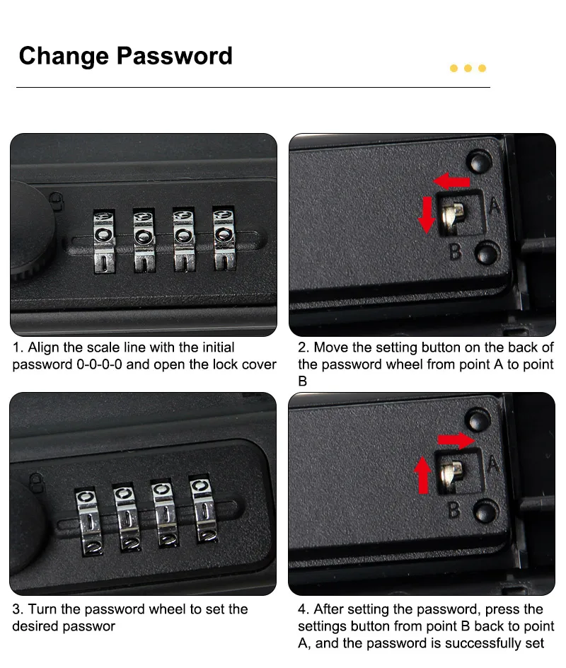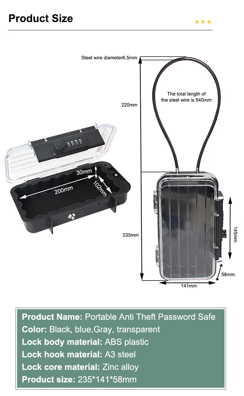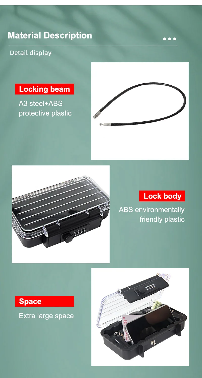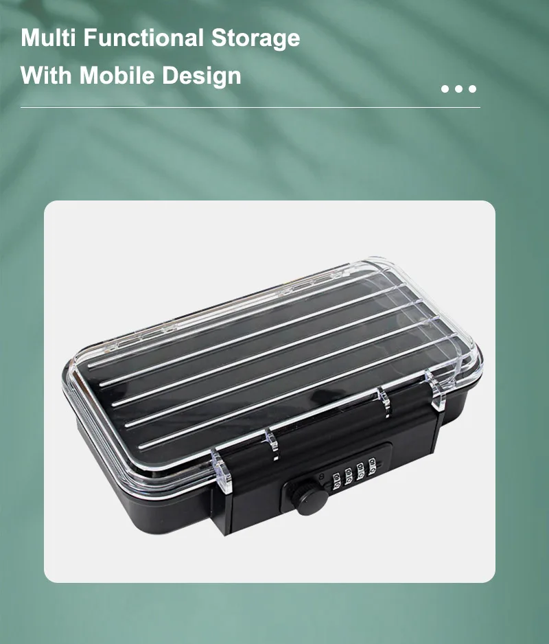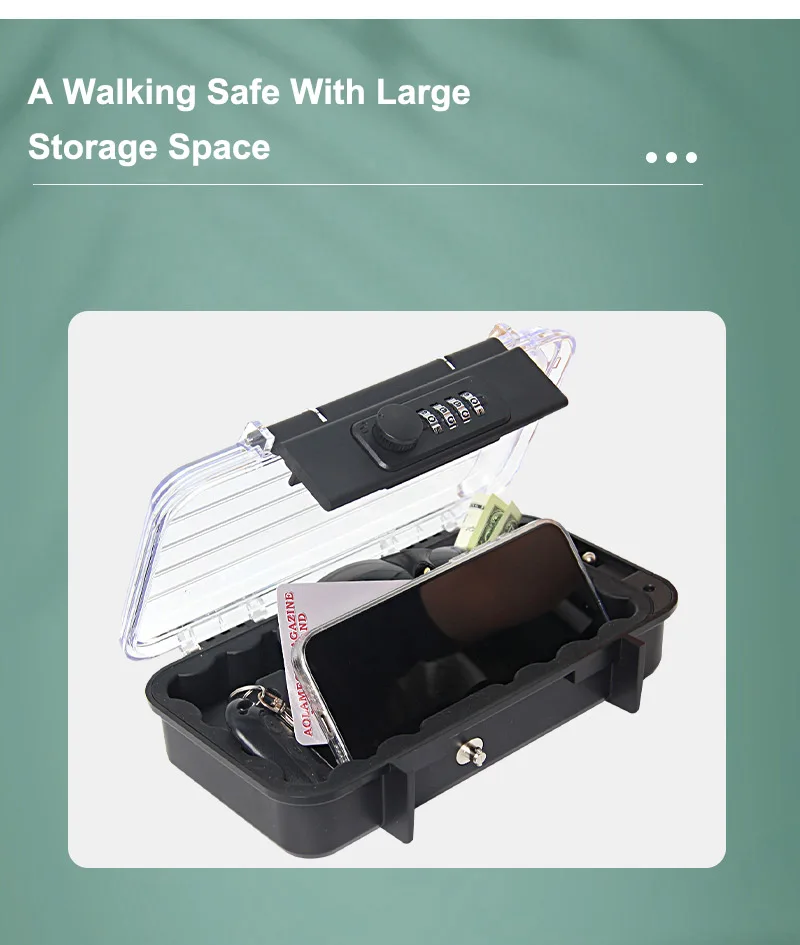 El estuche de almacenamiento de contraseña tiene un código de 4 dígitos reiniciable que proporciona hasta 10.000 combinaciones posibles, el interruptor de perilla adicional agrega una garantía de seguridad más, el diseño transparente le permite observar el interior en tiempo real, verificar la información de su teléfono celular, la seguridad financiera y si hay alguna entrada de agua en la playa.