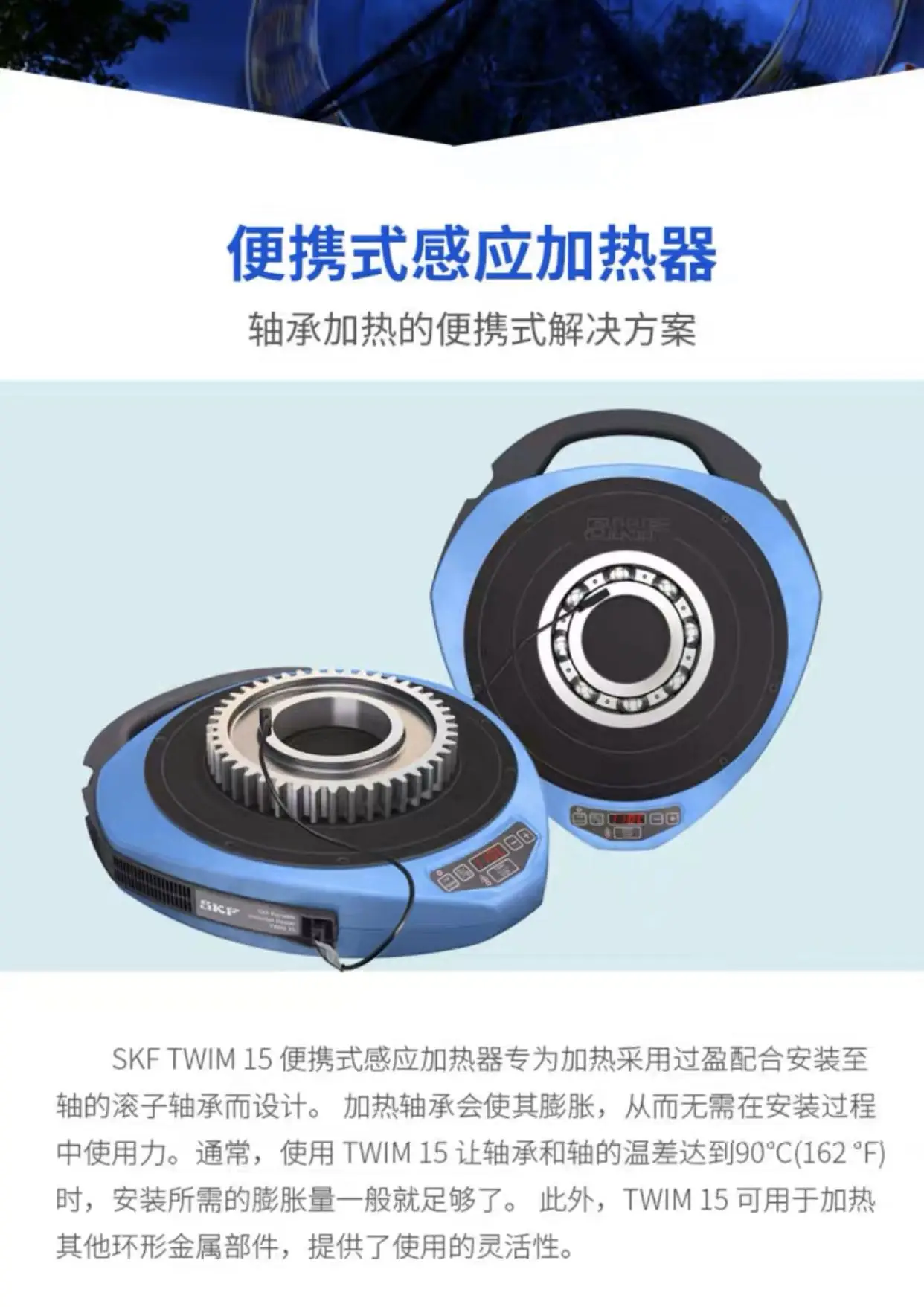 El calentador de inducción portátil SKF TWIM 15 está diseñado específicamente para calentar rodamientos de rodillos instalados en ejes mediante ajuste de interferencia. El calentamiento hace que el rodamiento se expanda sin necesidad de resistencia durante la instalación. Por lo general, el uso de TWIM 15 para crear una diferencia de temperatura de 90 ° C (162 ° F) entre el rodamiento y el eje es suficiente para iniciar la instalación. Además, TWIM 15 también se puede utilizar para calentar otros componentes metálicos circulares, lo que proporciona flexibilidad de uso.