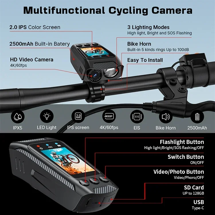 Cámara de Acción 4K para casco de motocicleta, DV deportivo multifunción con bocina de luz, pantalla HD, WiFi
