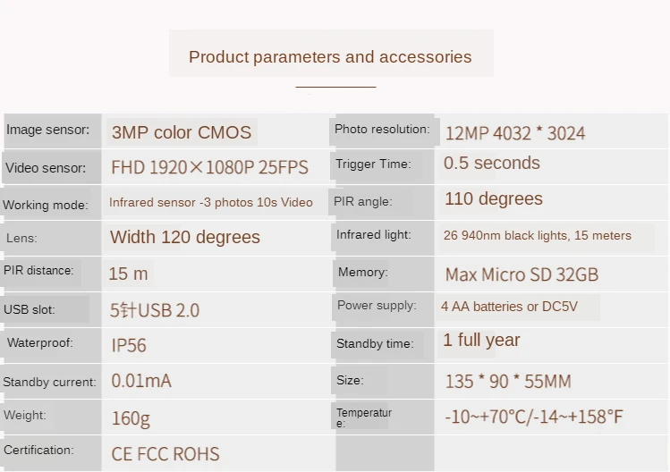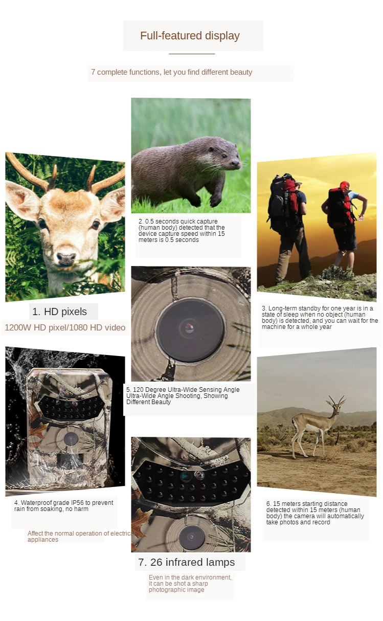 Esta cámara de caza tiene como objetivo ofrecer al usuario la experiencia más fácil de usar con características extraordinarias, como lente FOV de 120 °, LED IR de 26 °, tiempo de disparo de 1S, Y 1 foto/s, hasta 3 fotos y 10 archivos de vídeo por disparador.