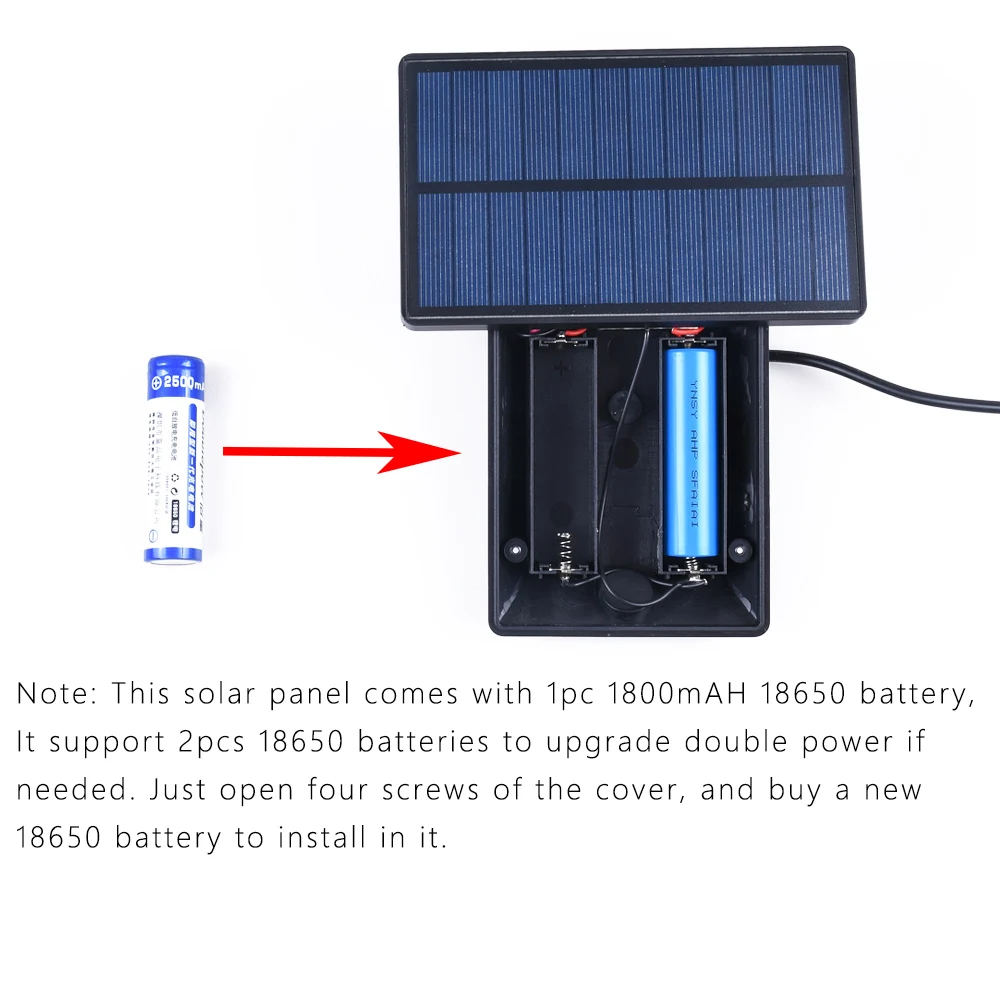 Este panel solar viene con 1 batería 1800mAH 18650. Admite 2 baterías 18650 para actualizar la doble potencia si es necesario.Simplemente abra cuatro tornillos de la tapa y compre una batería 18650 nueva para instalarla.