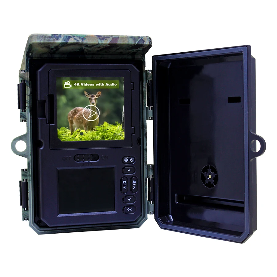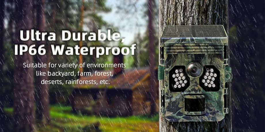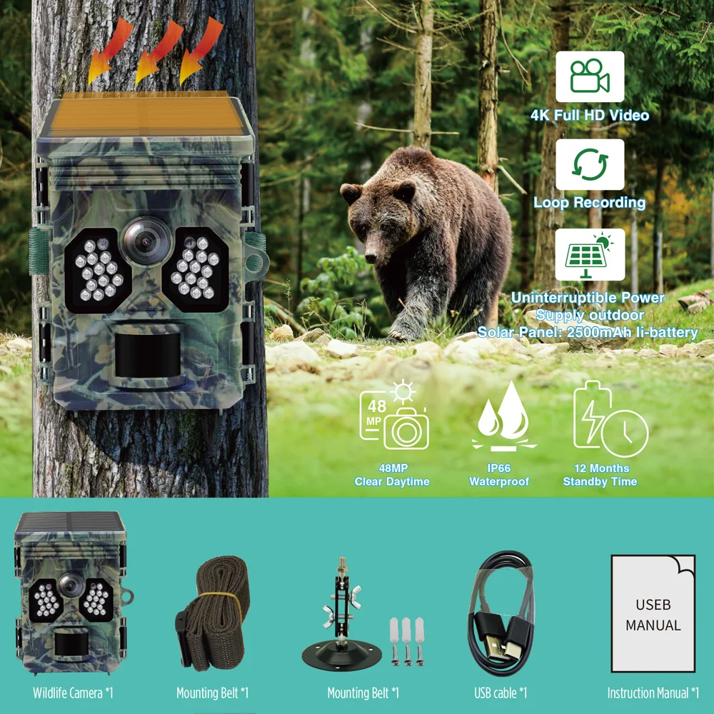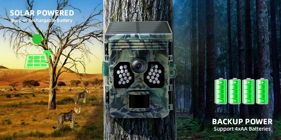 Cámara de caza con energía Solar 4K 48MP vídeo foto vida silvestre visión nocturna cámara de rastreo movimiento activado foto trampa impermeable IP66La cámara de seguimiento TC20 es su entrada asequible en vigilancia que funciona con energía solar.Con grabación 4K, 48 millones de píxeles y carga solar, garantiza una mayor duración de la batería.La fuente de alimentación dual admite baterías de litio y alcalinas.Con una pantalla LCD de 2,0", 60° Detección PIR y captura rápida de 0,4 s, logra un equilibrio entre simplicidad y funcionalidad.Con un tiempo de espera de 12 meses y impermeabilización IP66, el TC20 es su opción rentable para un rendimiento confiable de la cámara de seguimiento.
