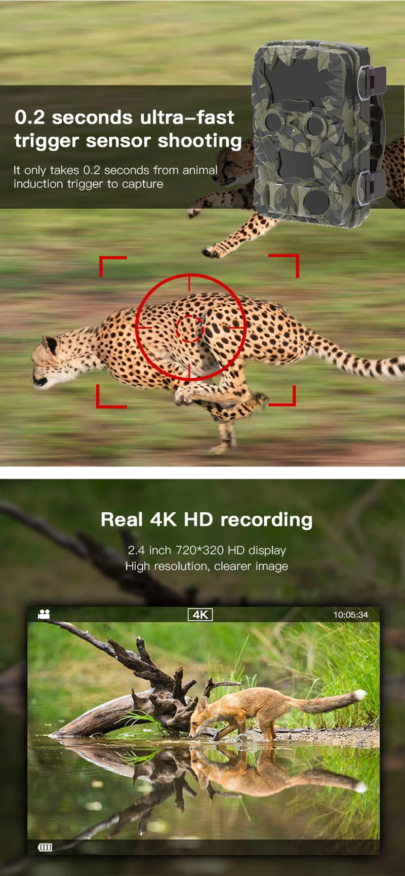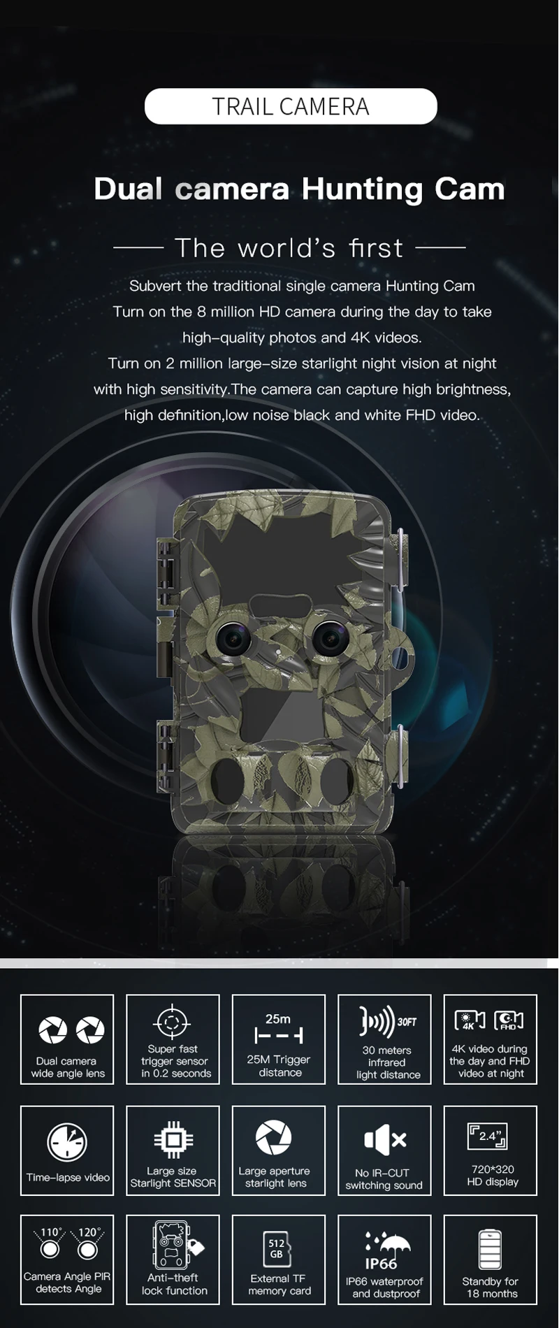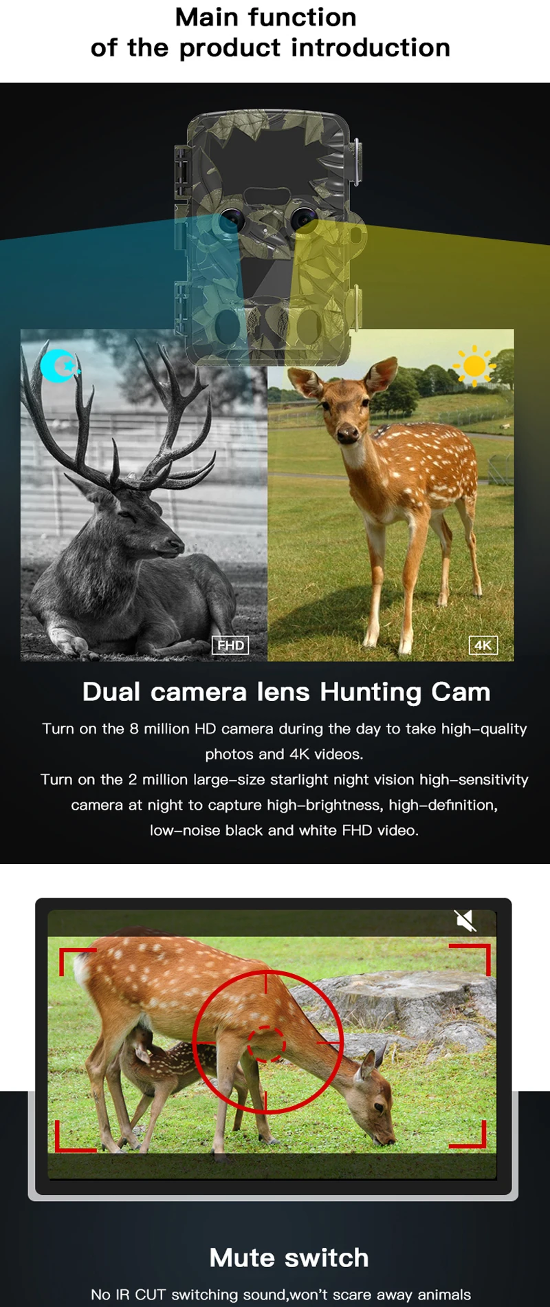 Una cámara de caza con dos cámaras.Una cámara de 8 megapíxeles captura imágenes de alta calidad con brillo normal durante el día, y la otra cámara con luz estelar de 2 megapíxeles captura imágenes de alto brillo, alta resolución y bajo ruido en un ambiente oscuro por la noche.