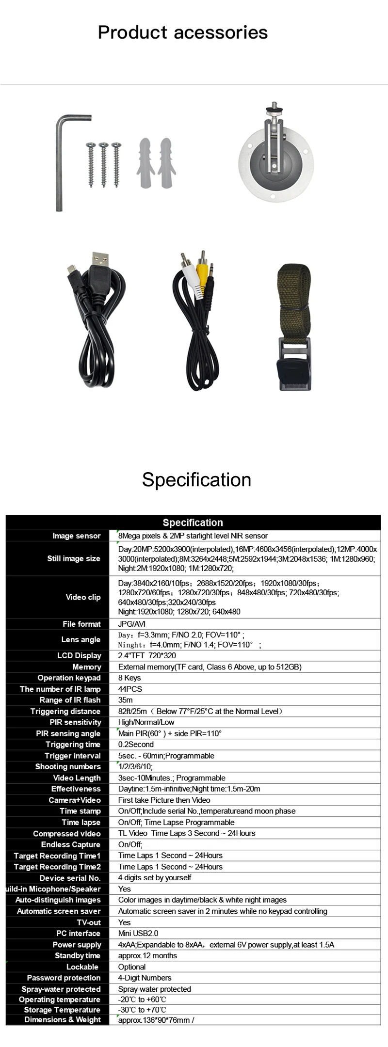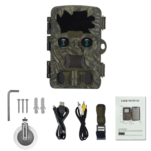 Lista de embalaje: cámara de caza × 1, manual de usuario × 1, cable USB × 1, cable AV × 1, cinturón de vendaje × 1, soporte de pared × 1.