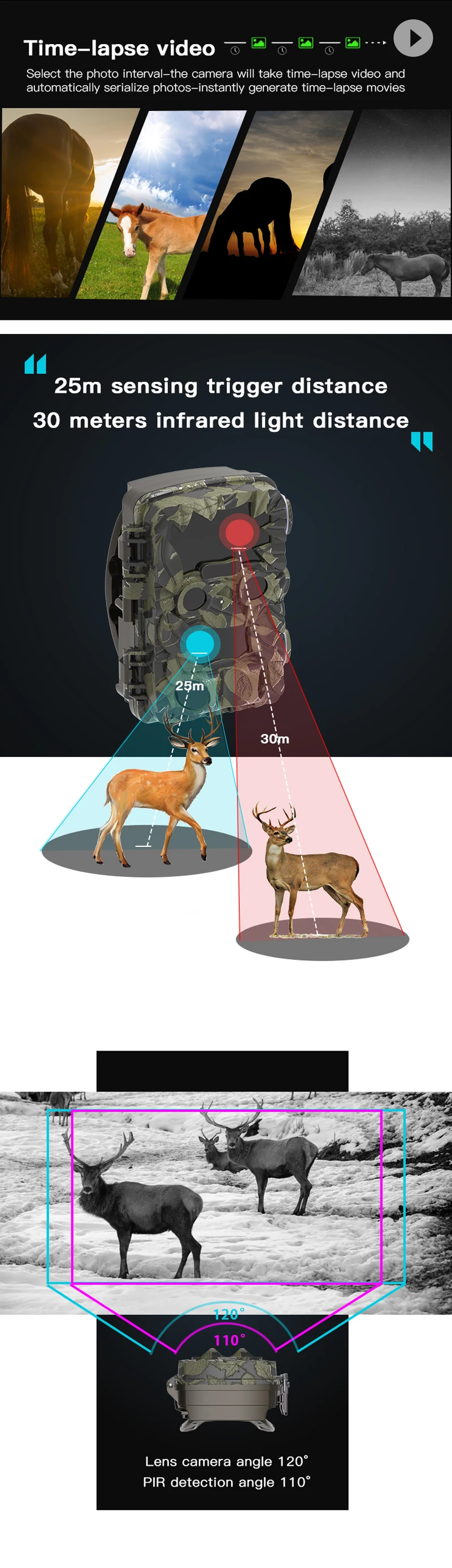 110° disparo con lente.3 PIR, 120° Ángulo de detección de gran angular, distancia de 35 metros.