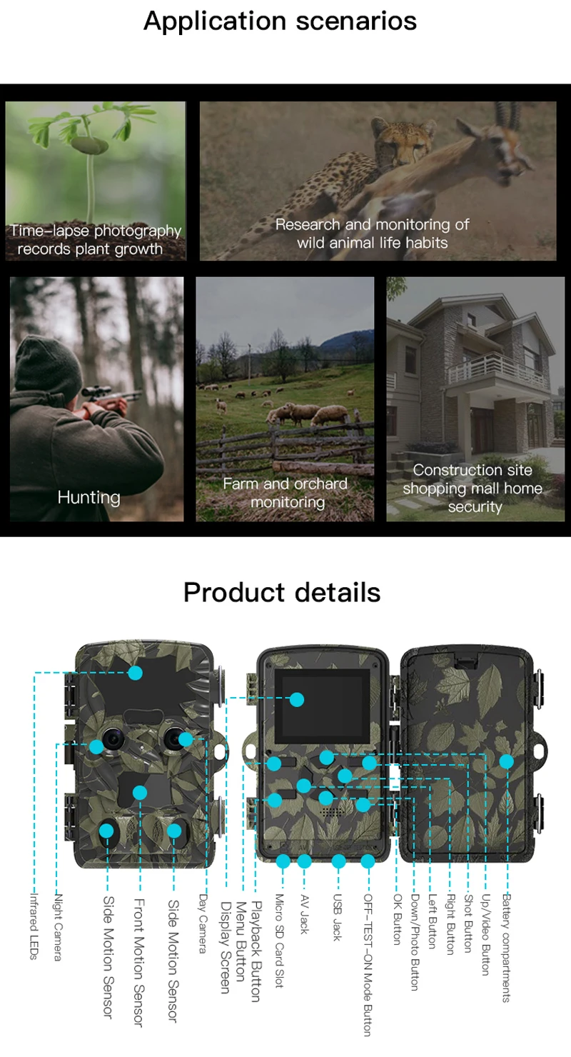 Multifuncional: la fotografía con lapso de tiempo registra el crecimiento de las plantas/busca y monitoreo de hábitos de vida de animales salvajes/caza/monitoreo de agricultura y huertos/seguridad del hogar de centros comerciales en sitios de construcción