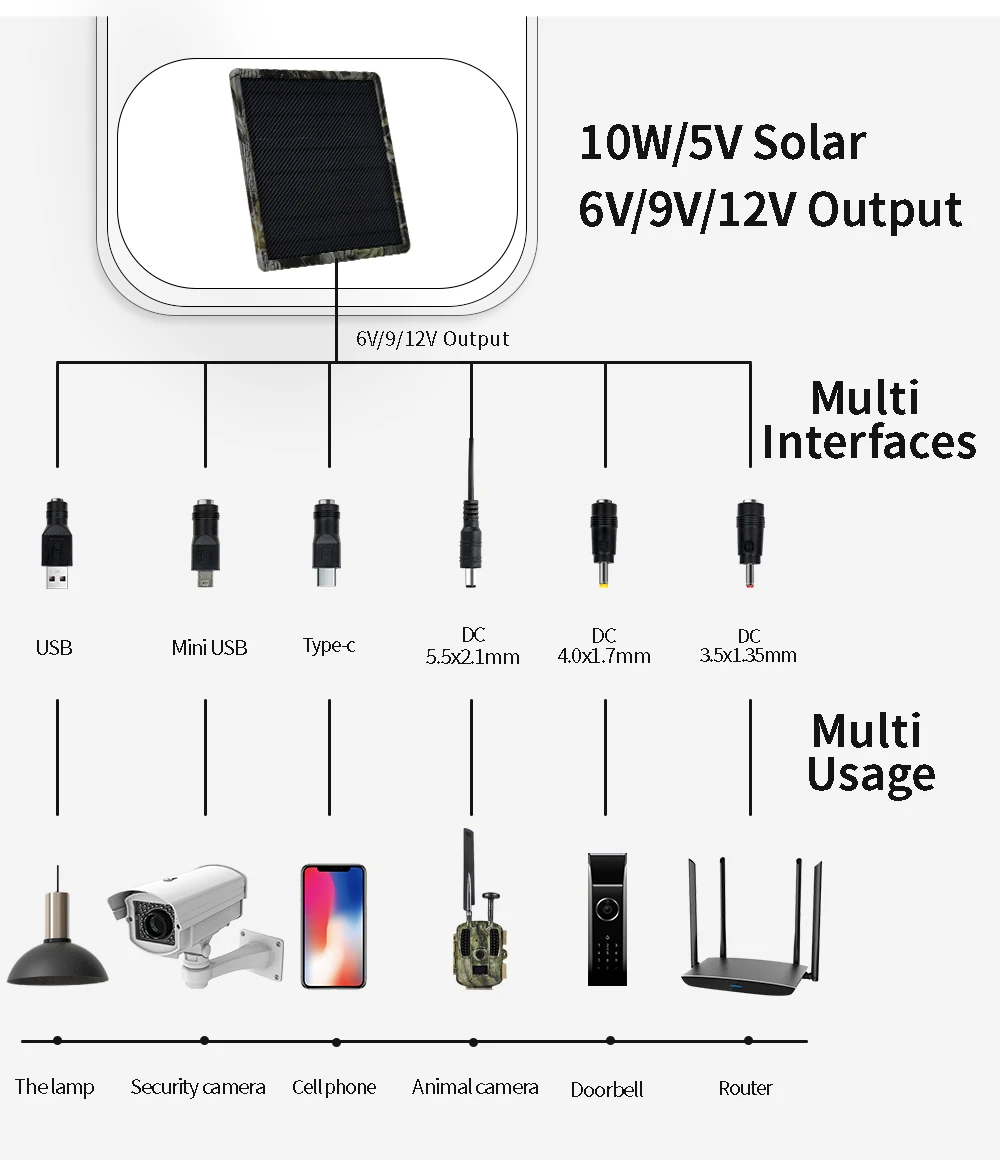 El máximo.El voltaje de entrada puede alcanzar los 28 V y la corriente de carga puede alcanzar los 4 A.Adecuado para la mayoría de productos para exteriores, como comedero para ciervos, cámara de rastreo, luces exteriores, teléfonos móviles, etc.