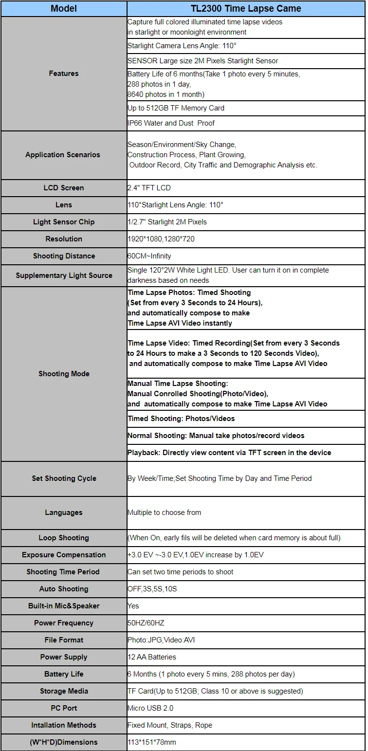 TL2300 Cámara de lapso de tiempo LED Cámaras digitales de baja luz A todo color 1080P FHD Grabadora de video Cámara con temporizador IP66 a prueba de agua