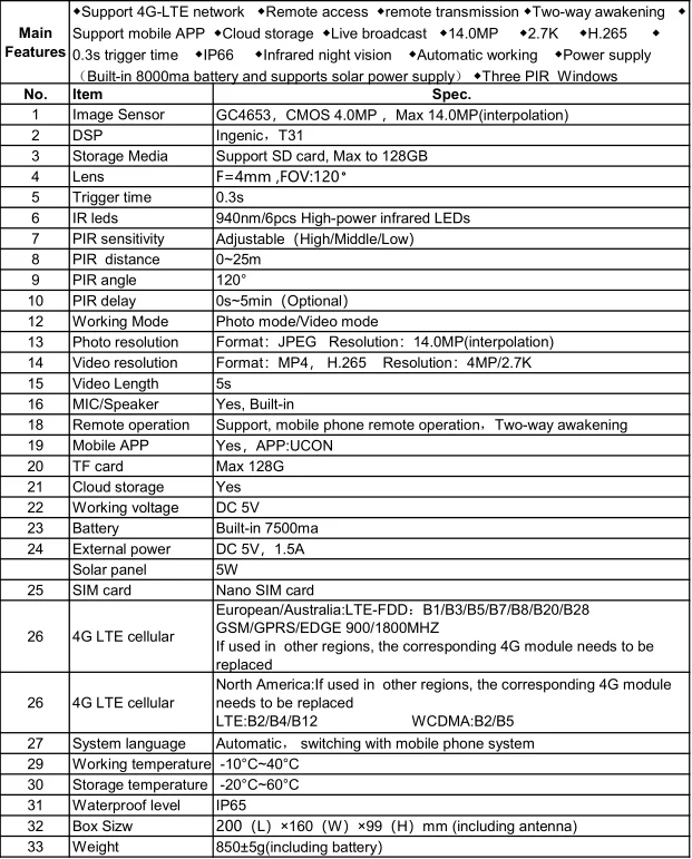 4G LTE celular: Europa/Australia: LTE-FDD: B1/B3/B5/B7/B8/B20/B28 GSM/GPRS/EDGE 900/1800MHZ (si se usa en otras regiones, el módulo 4G correspondiente debe serreemplazado)