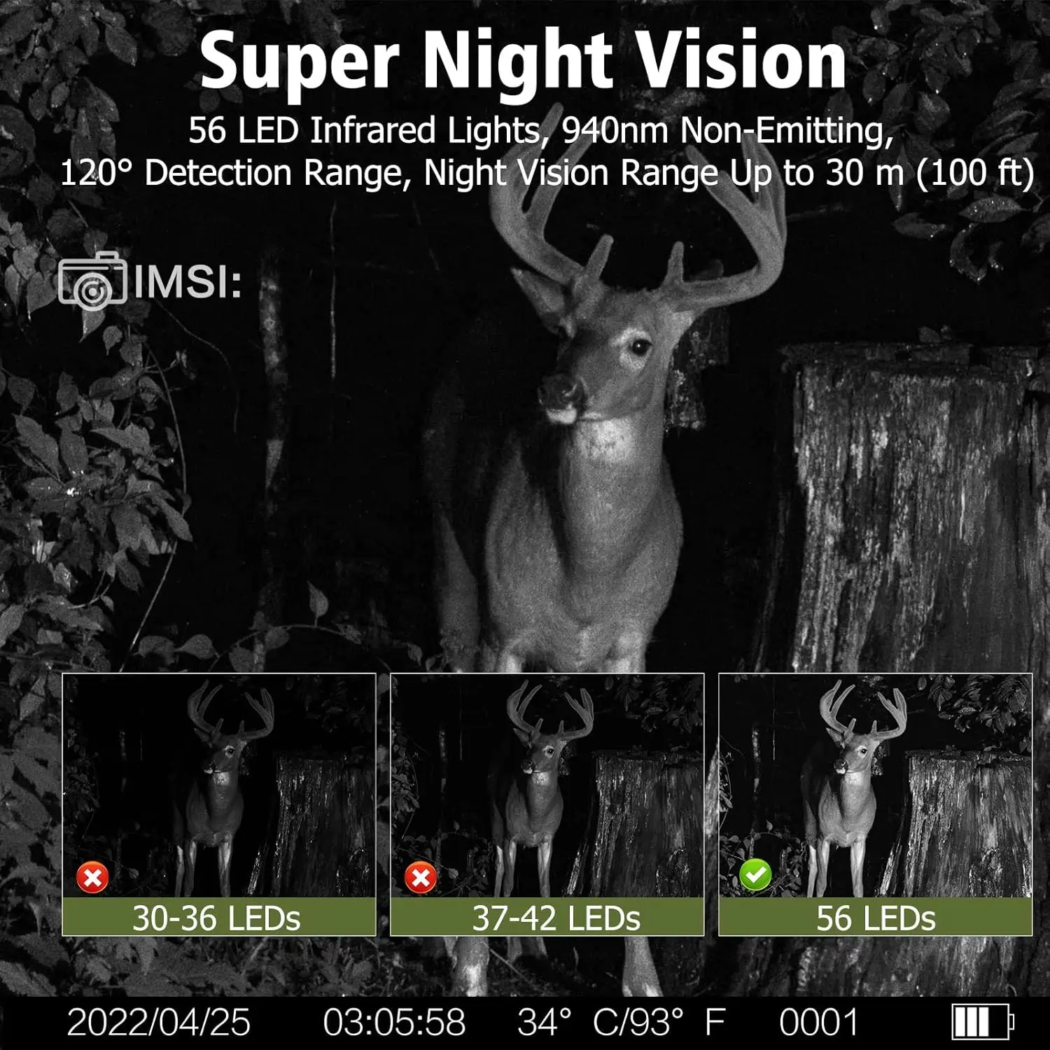 【Resolución ultraalta y visión nocturna sin brillo】4 millones de píxeles.Esta cámara de rastreo de juegos envía imágenes/vídeos a teléfonos móviles con imágenes de 30MP y videos de 2K tanto de día como de noche.Equipada con tecnología infrarroja sin brillo mejorada de 940 nm y 38 piezas, esta cámara de seguimiento captura imágenes y vídeos detallados de visión nocturna en blanco y negro en silencio, y los animales no se molestarán en absoluto para que nunca se pierda una foto.(incluye 4 pilas).Datos móviles gratuitos de 300M