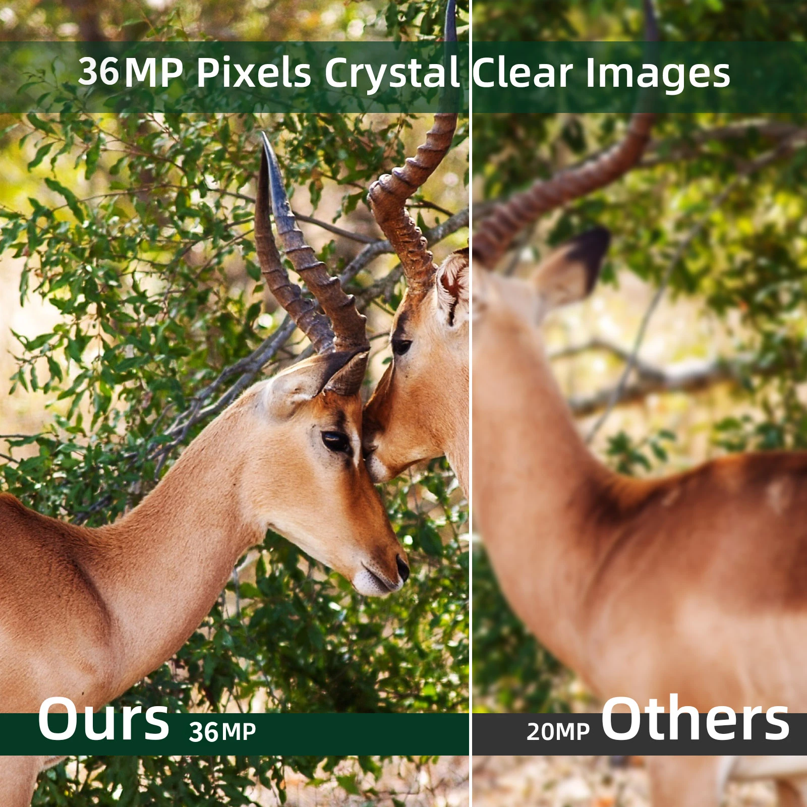 Esta cámara de rastreo cuenta con un sensor PIR de alta sensibilidad que se puede activar detectando cualquier movimiento de objetos o animales con una velocidad impresionantemente rápida de 0,8 segundos. Toma imágenes claras de 36MP y videoclips de 1520P, la elección perfecta para juegos de exploración al aire libre y observación de vida silvestre.