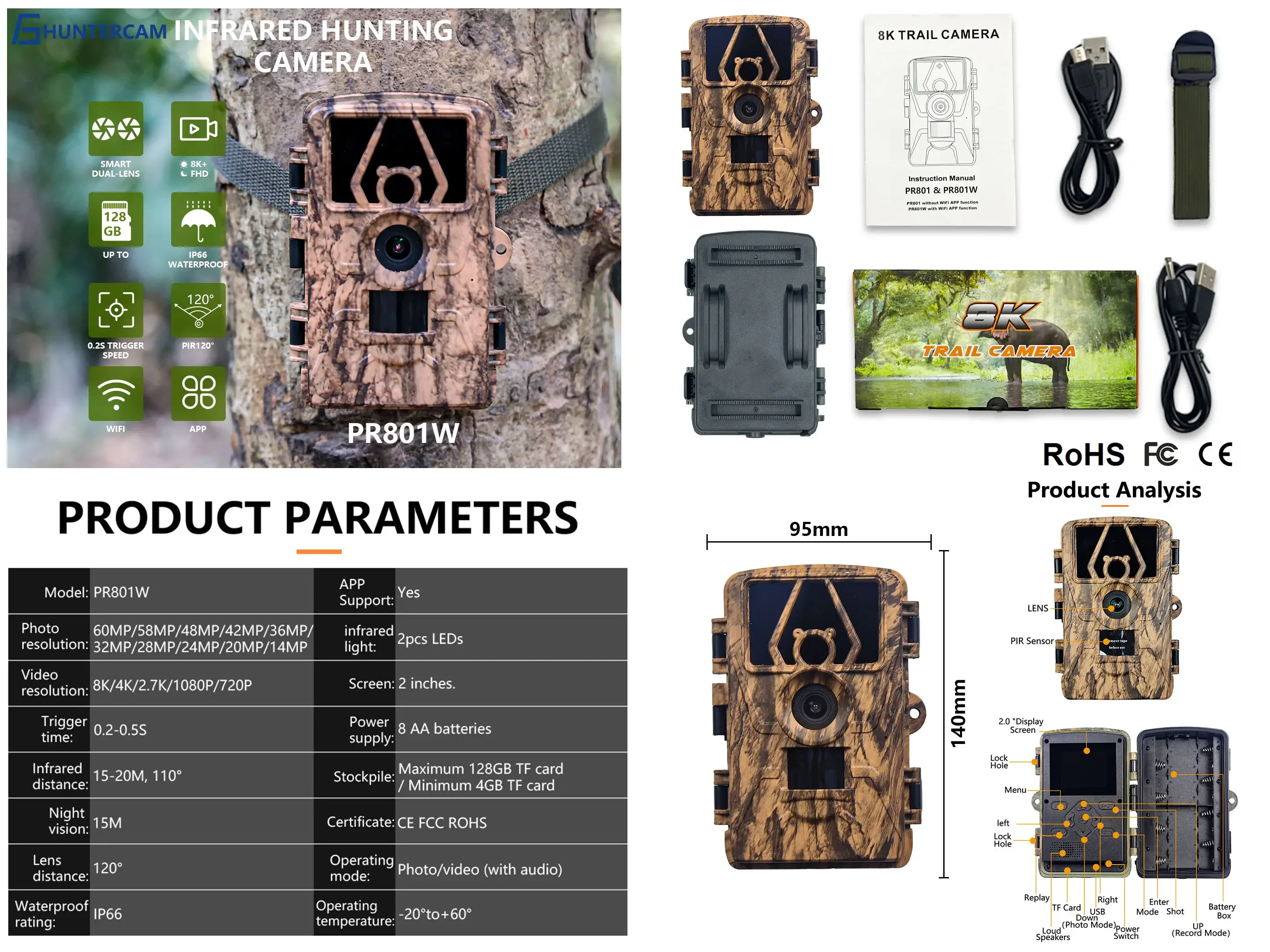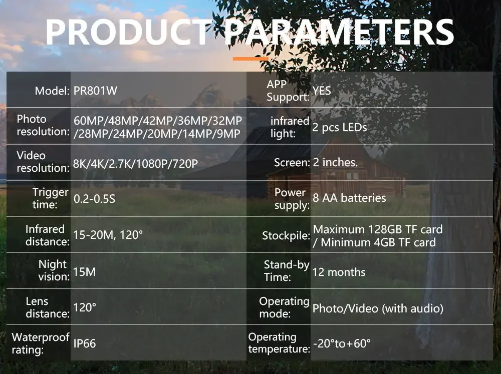 Admite el modo de detección de movimiento, un gran ángulo de 120 grados puede capturar fotografías y videos claros para todos los objetos con un máximo de videos de voz HD+ de 8K y fotografías de 60MP, lo que proporciona una vista completa del entorno circundante.La cámara está equipada con luces infrarrojas invisibles, lo que garantiza que la cámara permanezca oculta durante la toma y la grabación.