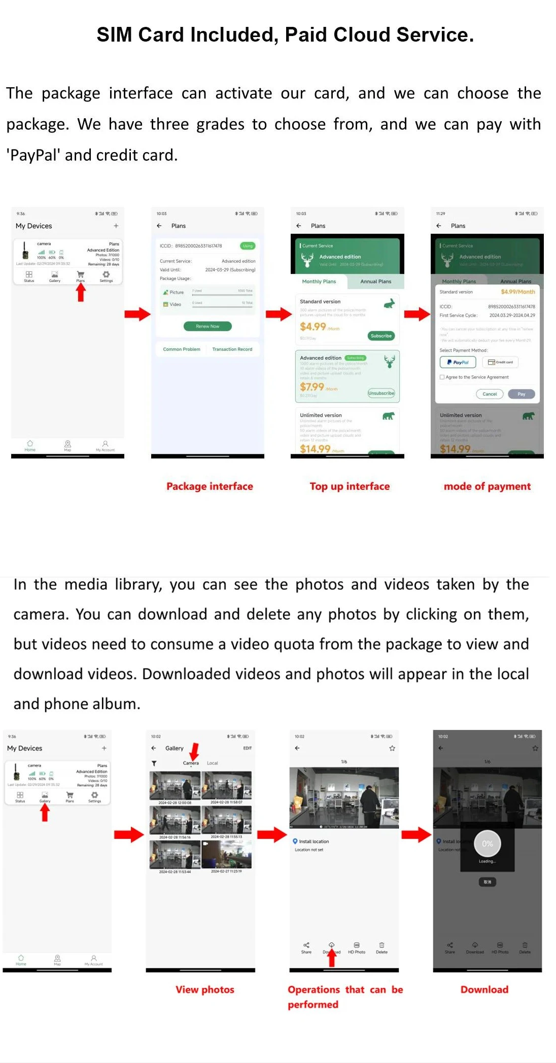 La cámara viene con una tarjeta SIM para servicios en la nube, que requiere pago para cargar o descargar videos y fotografías de la cámara. Puede pagar diferentes tarifas de tráfico (paquete) en la aplicación de la aplicación. La aplicación APP admite varios métodos de pago como PayPal y tarjeta de crédito.