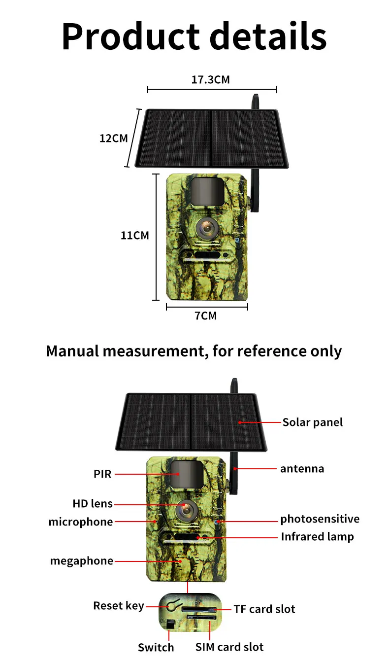 Número de modelo H50 Edición 4G APP Icono Píxel 3MP Sistema Linux + RTOS Chip de control principal Ingenic-T41 Sistema operativo APP Android, Apple IOS Formato de compresión de vídeo H.265 Formato de compresión de audio AAC y G.726 Modo detección Detección PIR + alarma de detección de movimiento Ai Rango de detección 0-20M Ángulo de detección 95° Modo alarma Llame al teléfono móvil o envíe información en tiempo real Lámpara infrarroja 940nm Distancia visión nocturna 25m Altavoz incorporado 3W Micrófono incorporado El rango de recogida es de 20m Distancia de enfoque 3,6mm Ángulo 85° Almacenamiento en la nube Almacenamiento en la nube (video de alarma) Almacenamiento local Tarjeta TF (máx. 128G) Modo fuente de alimentación Panel solar + batería Material de la célula solar Silicio monocristalino Energía solar celular 4W Batería 3 secciones incorporadas 18650 Potencia máxima de trabajo 2,5 W Potencia de espera 0.003W Ambiente laboral Interior/exterior Temperatura de funcionamiento -30°~+60° Humedad DE TRABAJO 0% ~ 90% RH Tamaño caja 19,3*16,7*10,1 CM Peso caja 0,92 KG