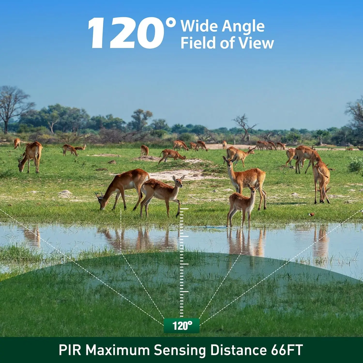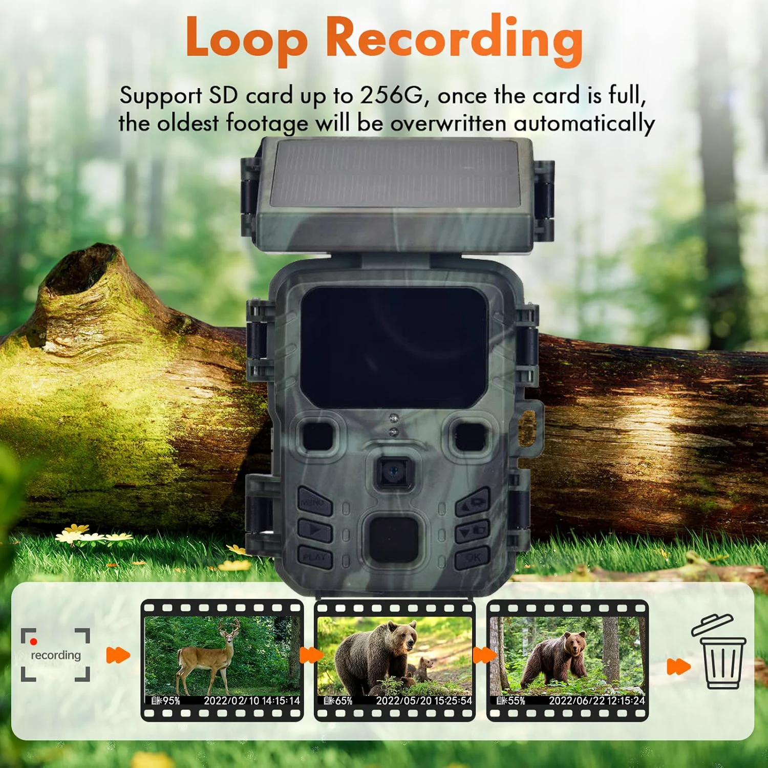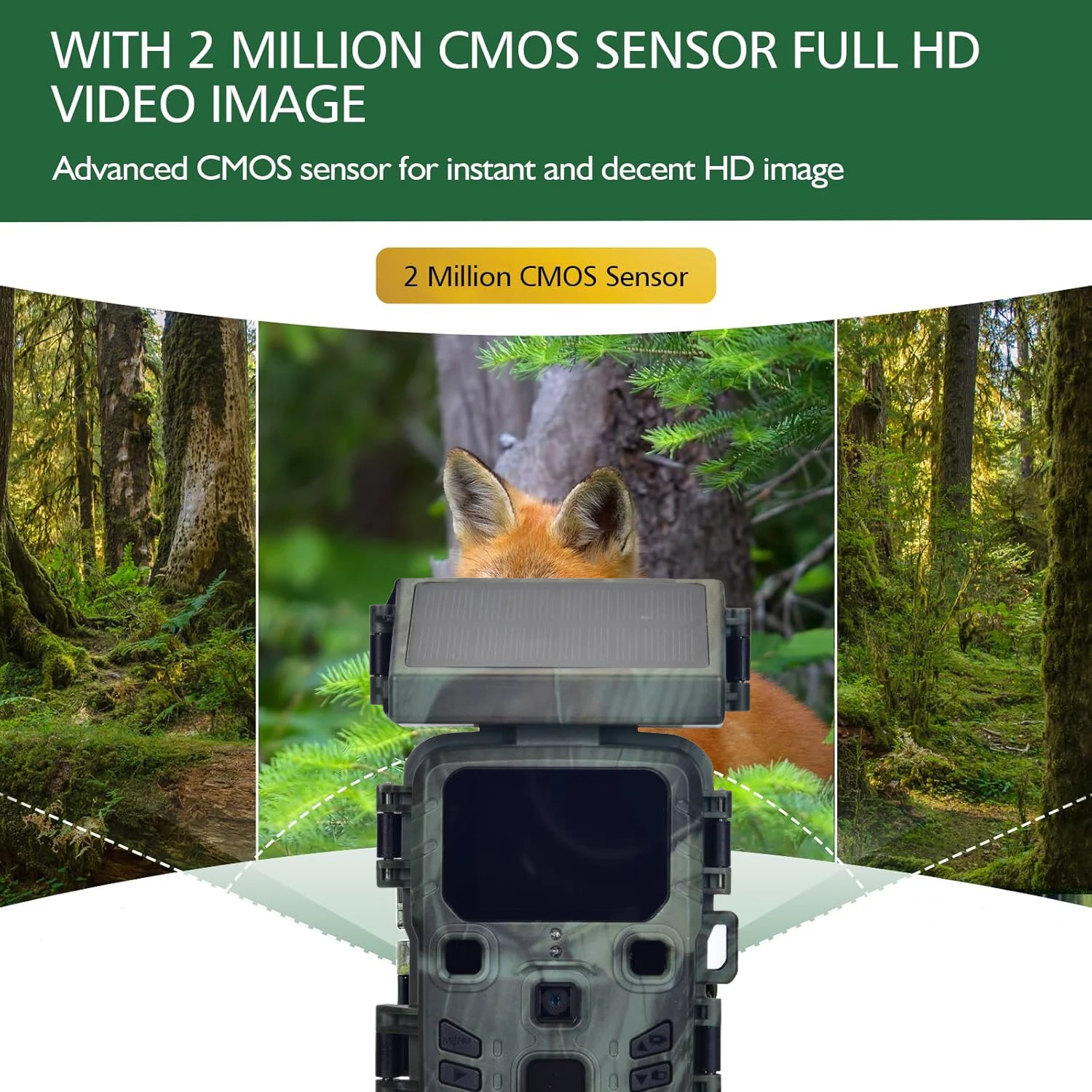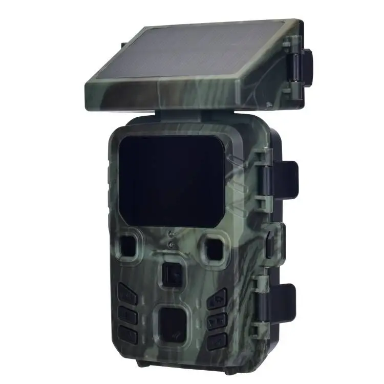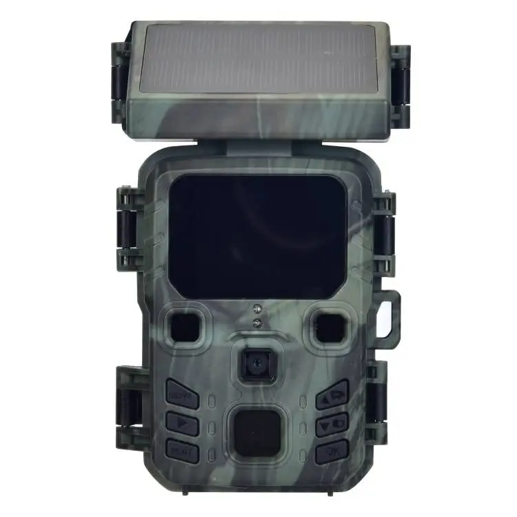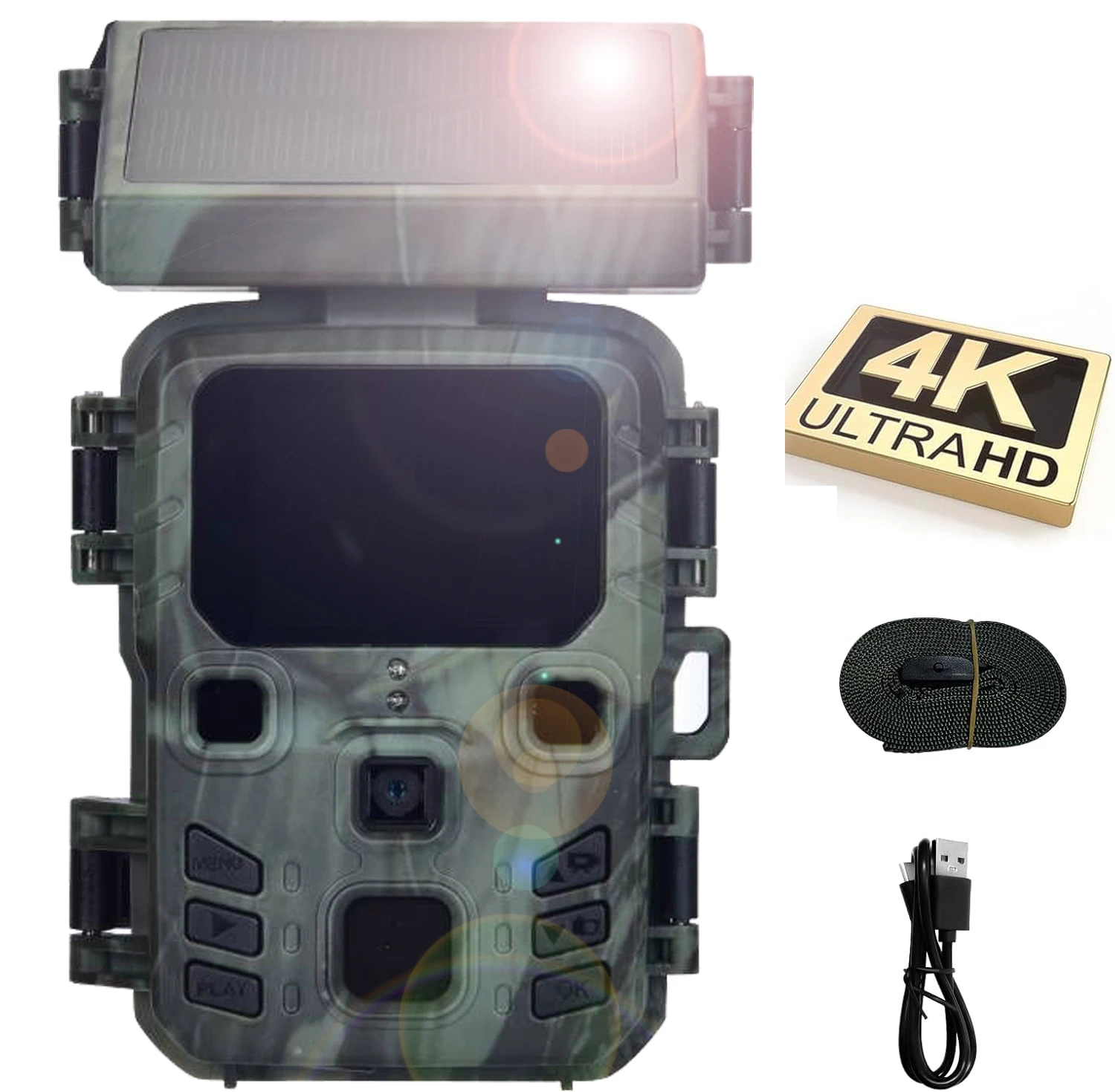 Esta cámara solar para senderos tiene una batería recargable incorporada de 2200 mAh y puede funcionar con el panel solar en la parte superior de la cámara.Reducir el consumo de batería mientras protege el medio ambiente. Características:Cámara de rastreo con energía solar y batería de litio incorporada, perfecta para monitoreo de vida silvestre, caza de ciervos al aire libre y seguridad del hogar.Diga adiós al reemplazo frecuente de la batería.Capture vídeos 4K ultra claros e imágenes de 50MP, de día o de noche.Equipada con sensores infrarrojos pasivos (sensores PIR sensibles), esta cámara de seguimiento puede capturar vida silvestre en solo 0,5 s cuando se detecta movimiento.Esta cámara solar para senderos admite una tarjeta de memoria de hasta 256 GB, lo que le permite tomar más fotografías y vídeos.Esta cámara de seguimiento solar es el mejor regalo para cazadores. Especificaciones:Material: Plástico Sensor de imagen: 5 megapíxeles Color Memoria CMOS: Tarjeta TF a 256 GB Lente: F=2,8; FOV=90°Pantalla: 2.Modo TFT de 0 pulgadas: Cámara/Vídeo/Cámara y Vídeo/Timelapse PIR Rango de detección: 120 grados Distancia de visión nocturna: 60 pies/20 m LED IR: 4 piezas 3 W LED de alta potencia Distancia PIR: 60 pies/20 m Velocidad de disparo: 0.Intervalo PIR de 5 segundos: 5 segundos ~ 60 minutos (predeterminado 5 segundos) Resolución de imagen: 50MP: 9344x5256P;36MP:8000x4500P;24MP: 6528x3672P;20MP:6144x3456P;16MP:5376x3024P;12MP:4608x2592P;8M:3840x2160P;5M:3702x1728P;3M:2304* 1296P;1M: 1280*720P Fotos múltiples en una detección: 1/2/3/10 Resolución de vídeo: 3840x2160P/10 fps;2688x1520P /20fps;1920x1080P/30fps;1280x720P/60fps;848x480P /30fps;720x480P/30fps;640x480P /30fps Formato de archivo: JPG/AVI Contraseña Seguridad: 4 códigos PIN digitales Corriente de espera: 0.2 mA Tiempo de espera: 6 meses Interfaz: USB tipo C;Soporte para tarjeta Micro SD;Conector para tarjeta SIM Detección de movimiento: Baja/Media/Alta Temperatura de funcionamiento: -20 ~70℃ (-4~158℉ ) Alimentación: Li-on de 2600 mA incorporada y 4 pilas AA (no incluidas) Resistente al agua: IP65 Tamaño: 9 * 10 * 15 cm / 3,5 * 3,9 * 5,9 pulgadas Peso: 480 g / 16,9 oz Lista de paquetes:1 * cámara 1 * cable USB 1 * Manual