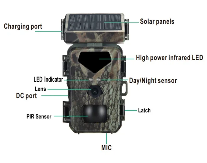 *1.Tecnología de panel solar integrada: la cámara adopta un panel solar integrado.La potencia de carga de las baterías de litio recargables y los paneles solares puede proporcionar una duración ilimitada de la batería.