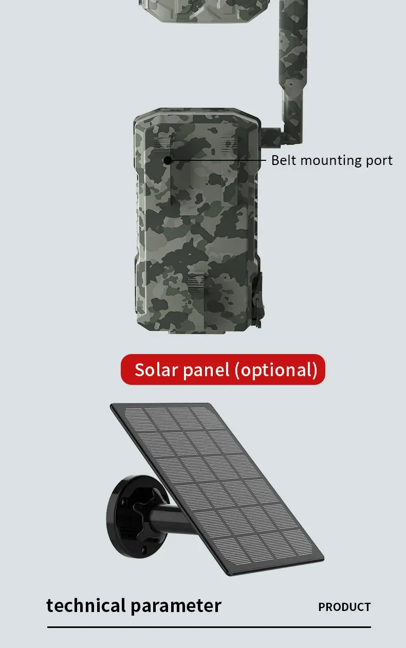 Fuente de alimentación solar + batería de litio incorporada (panel solar externo o adaptador de corriente opcional)