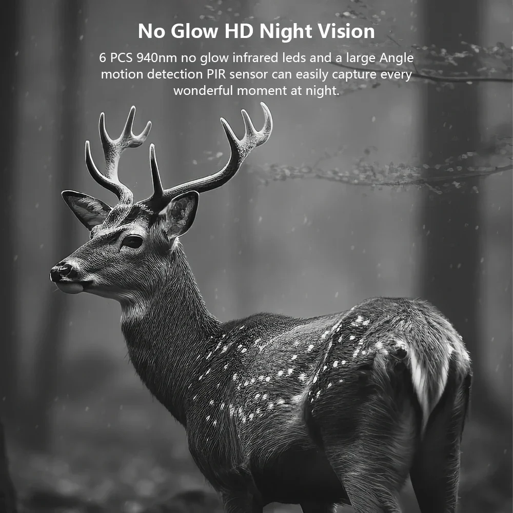 Las cámaras Trail están alimentadas por la avanzada tecnología NO-GLOW.Equipado con 6 piezas de LED IR de 940 nm, la luz infrarroja de las cámaras de caza no es visible.Le permite observar sus comederos, trampas y vida silvestre sin asustar a los aniamls.La mejor calidad de imagen/vídeo para realizar su trabajo de observación.La cámara Trail ajustará inteligentemente su luz según la luz del día.Produce imágenes coloridas durante el día e imágenes en blanco y negro durante la noche.