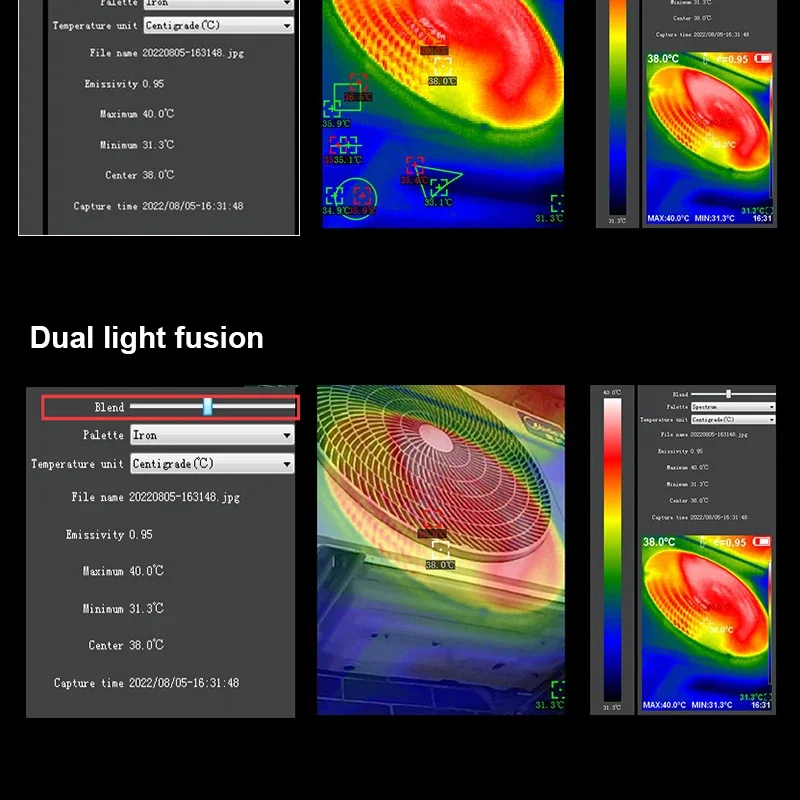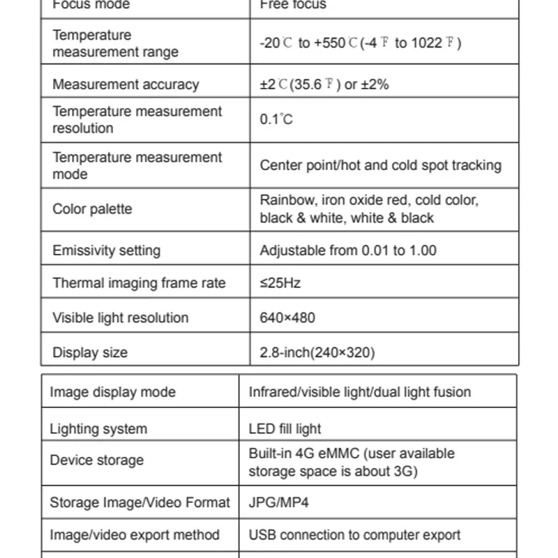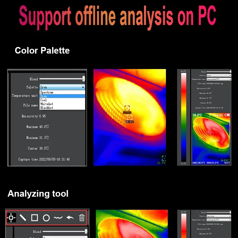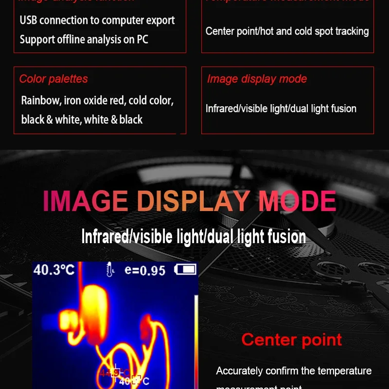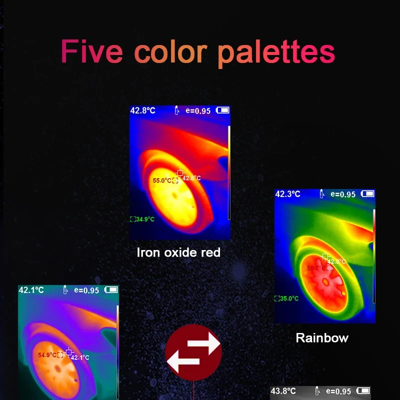 [Diseño de 5 modos de imagen]:arco iris, óxido de hierro rojo, color frío, blanco y negro, se pueden seleccionar cinco modos de imagen
