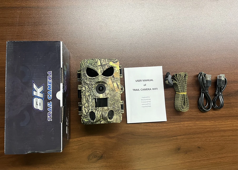 Specification: Motion Detection available Photo Size: 60/48/42/36/32/28/24/20/14/9MP Video Resolution:8K/4K/2.7K/1080P/720P Screen: 2 inch Trigger Time: 0.2~0.5s PIR Distance: 15-20M, 110 degree IR Distance:15M Lense Range:120 degree Waterproof spec: IP66 APP Support: TrailCam Go IP LED: 4pcs, LED black Lights Power supply: 8pcs AA batteries (not included) Memory: Maximum 128GB TF Card Certification: CE FCC ROHS Work Mode: Photo/Video(with Audio) Operating Temperature: -20~+60℃