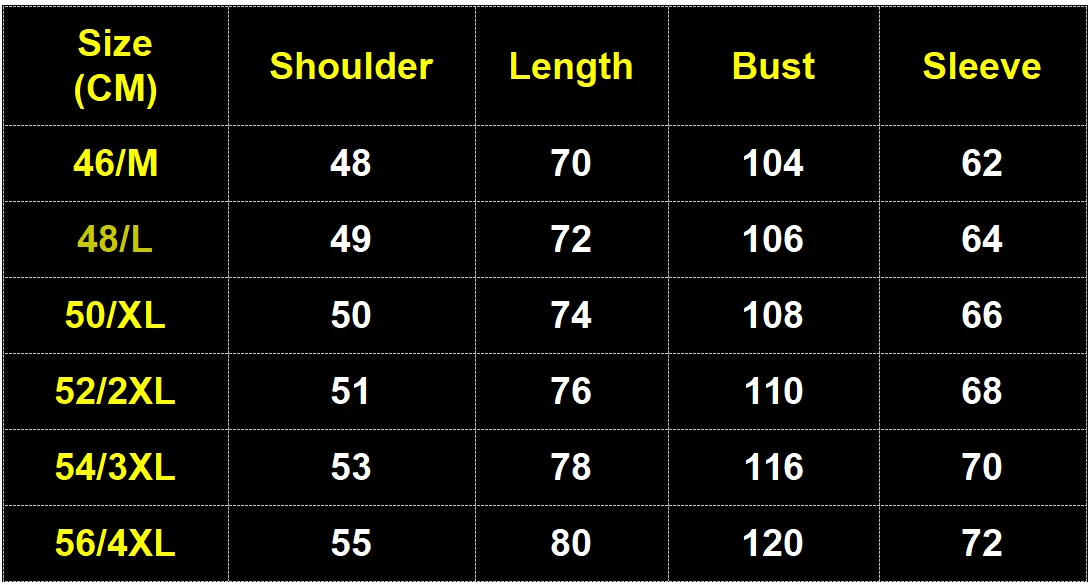Tamaño: 44/S,46/M,48/L, 50/XL, 52/XXL, 54/XXXL, 56/4XL