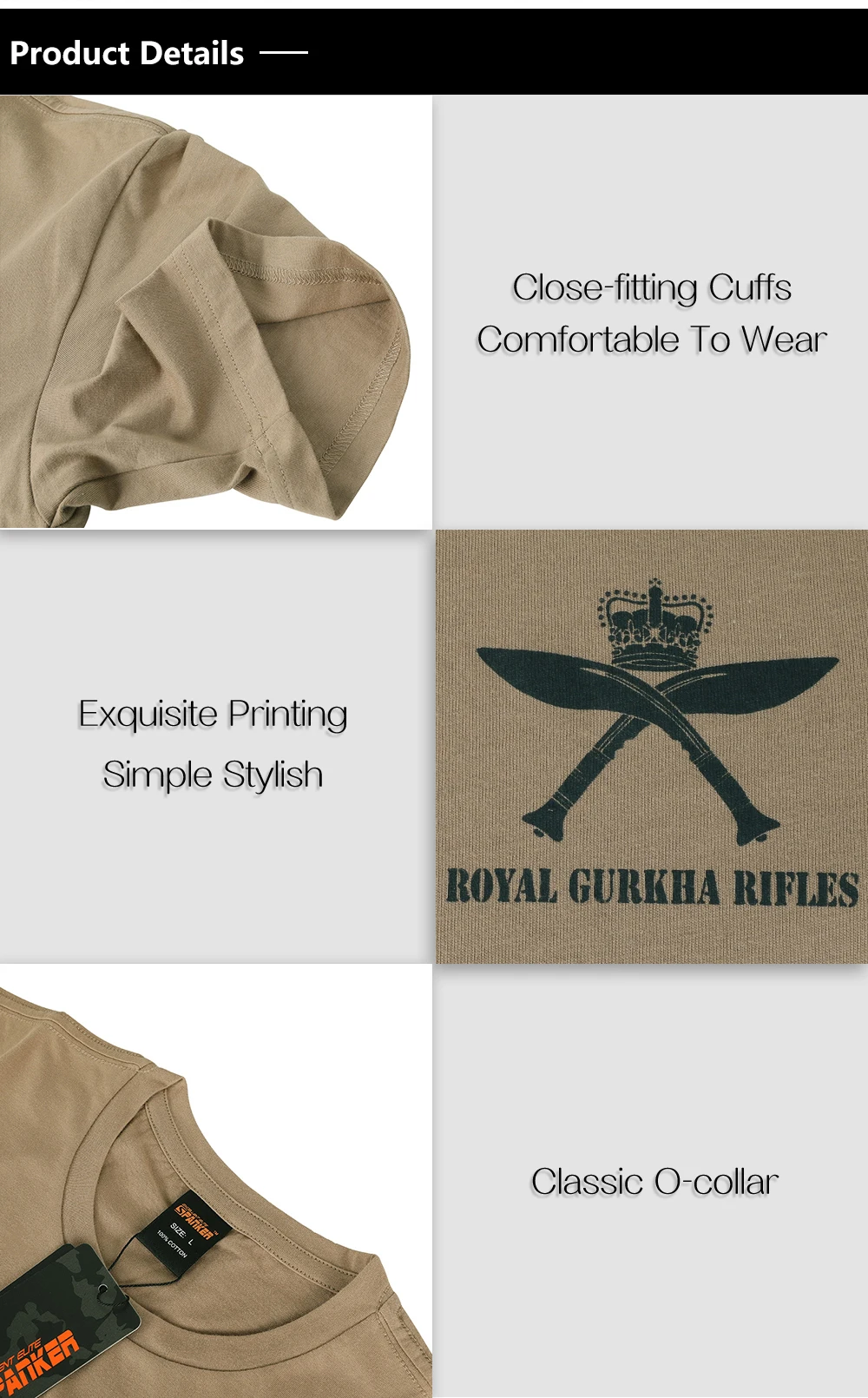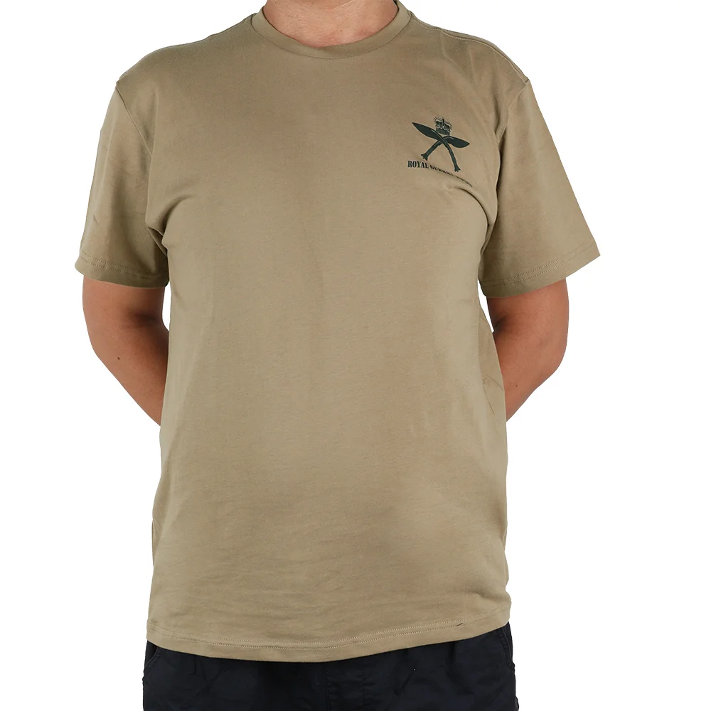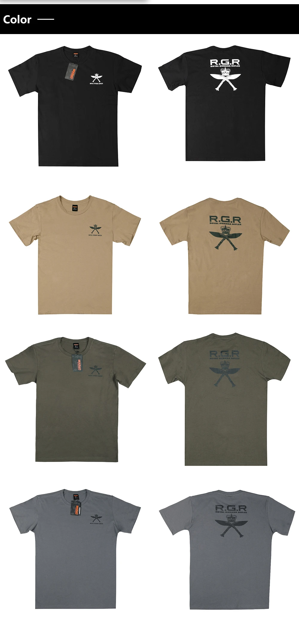 El patrón trasero "R.G.R" y "ROYAL GURKHA RIFLES" palabras sobre el machete y la corona de nepal. Las mangas del brazo izquierdo tienen un patrón de bandera del Reino Unido.