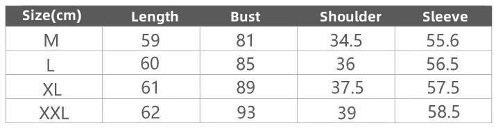 La Tabla de tallas es la siguiente, elige según el tamaño de tu cuerpo. Hay un margen de error de 1-2cm, si no está seguro del tamaño, envíeme la información de su altura, peso y cintura, te ayudaré a elegir la talla correcta.