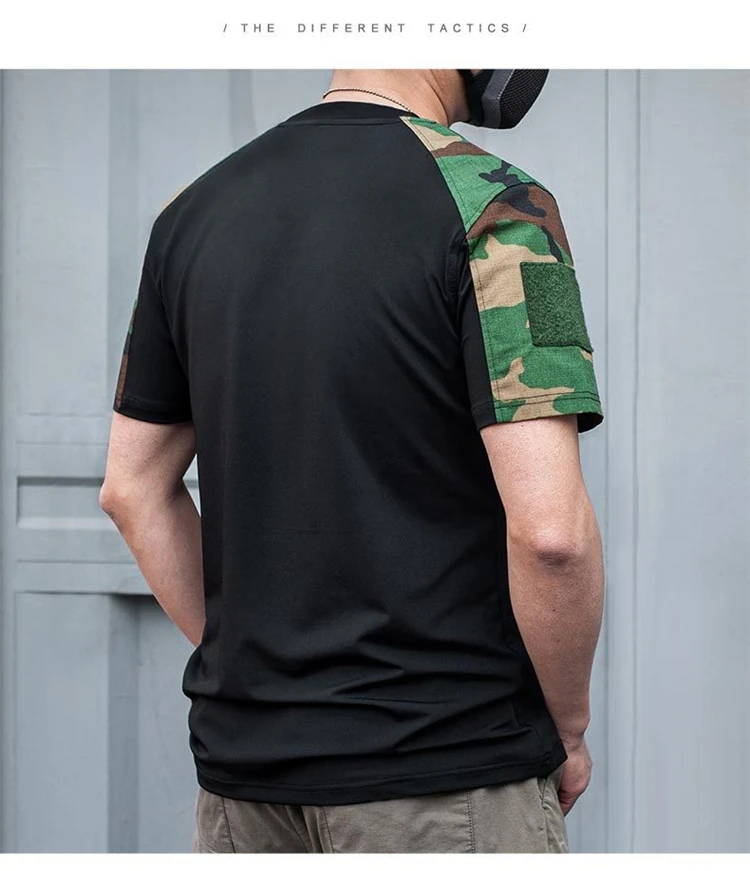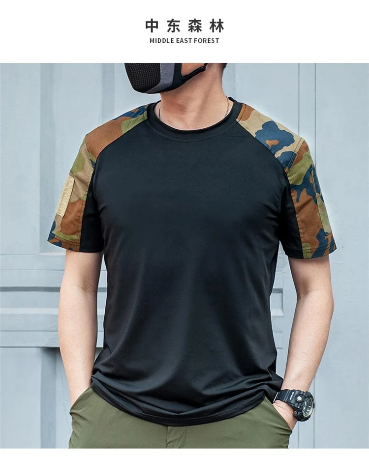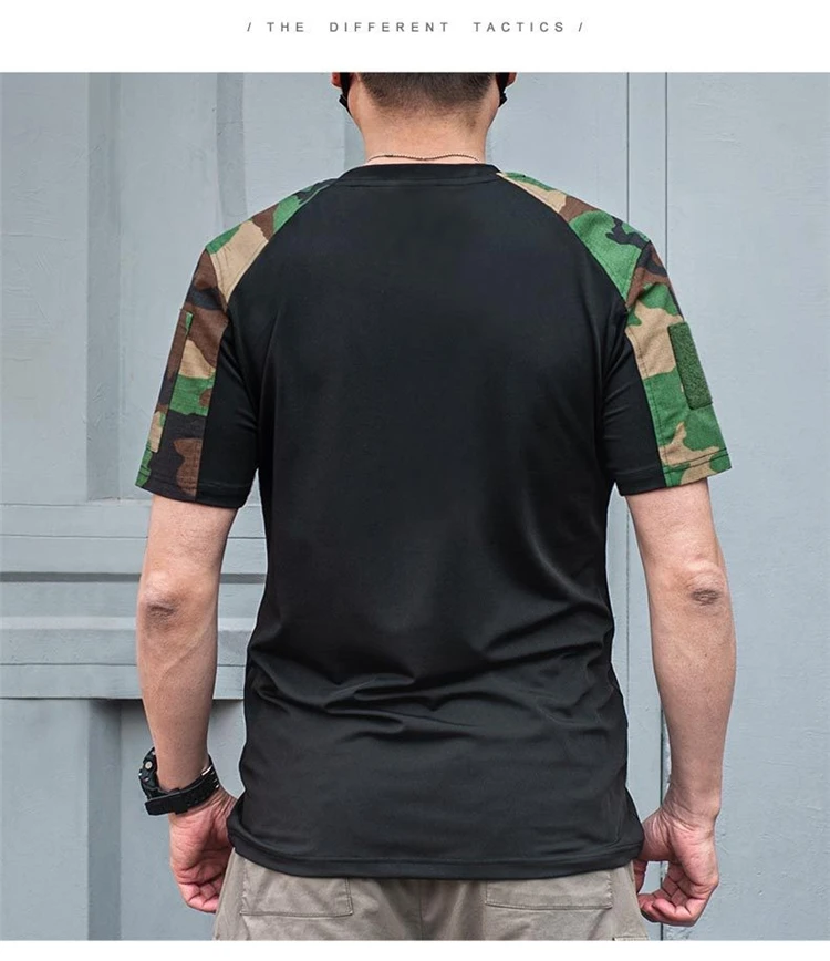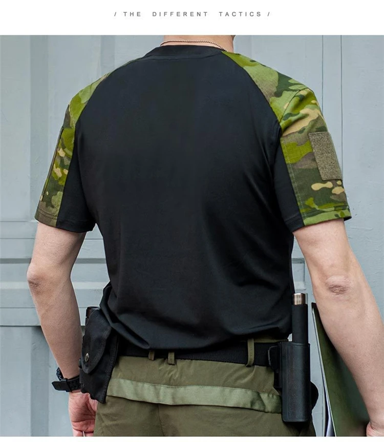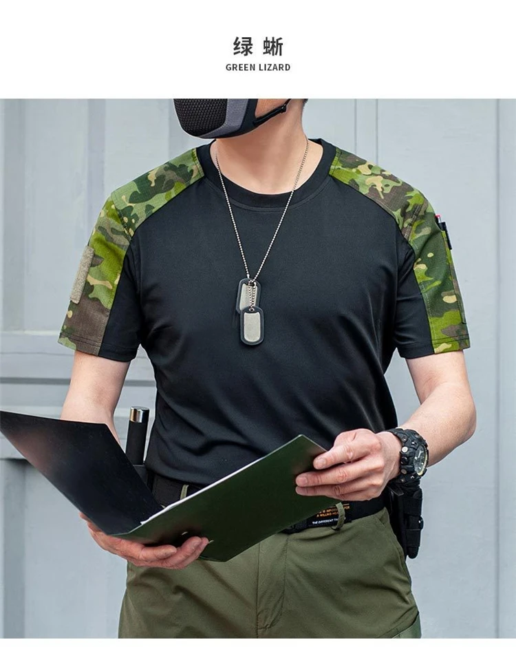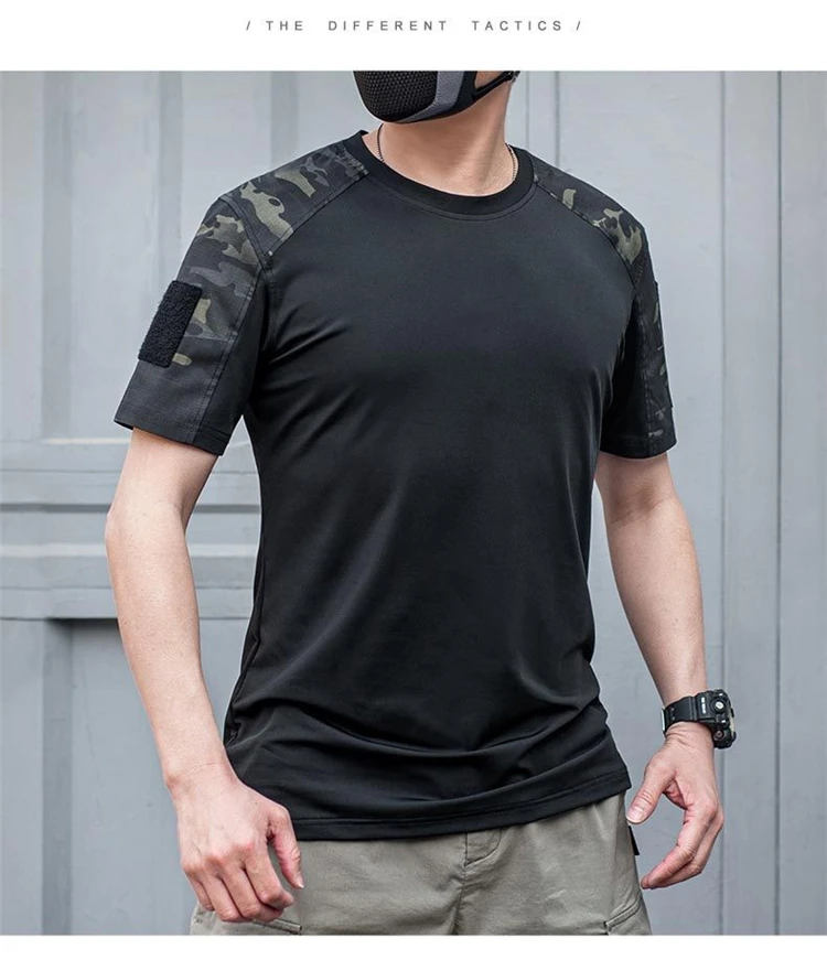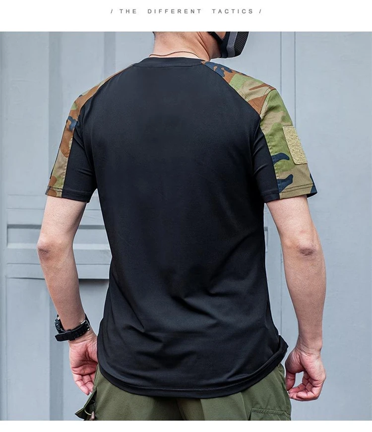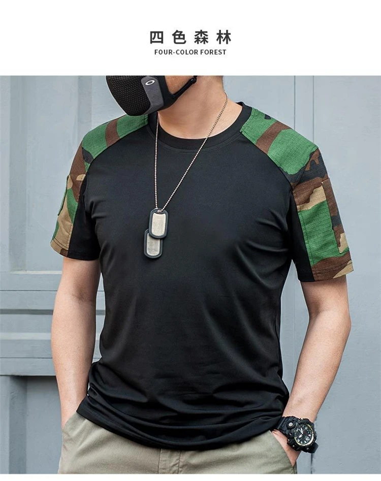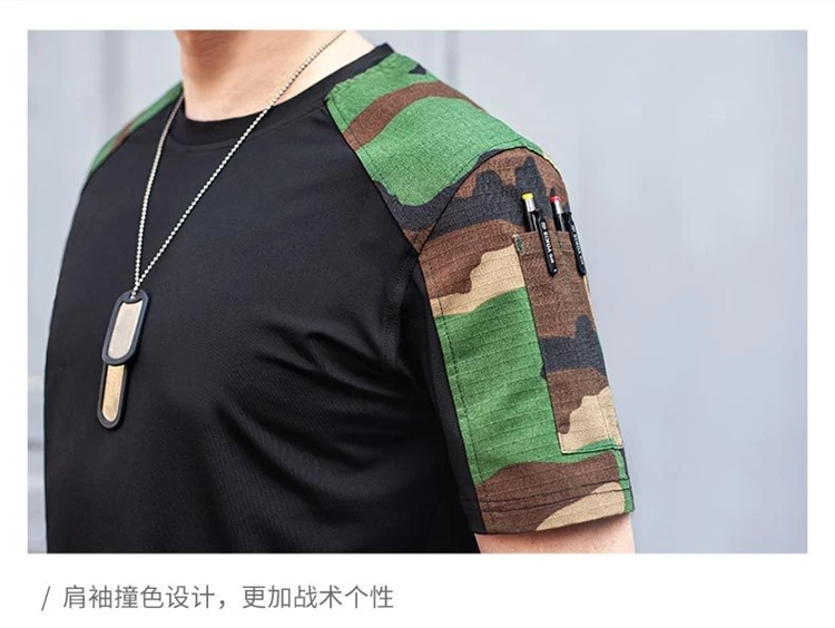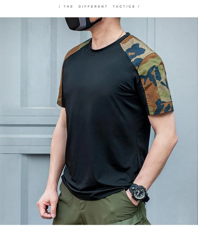 Camiseta táctica de cuello redondo para hombre, camisa de manga corta de secado rápido para exteriores, Color camuflaje, empalme de colisión, secado rápido