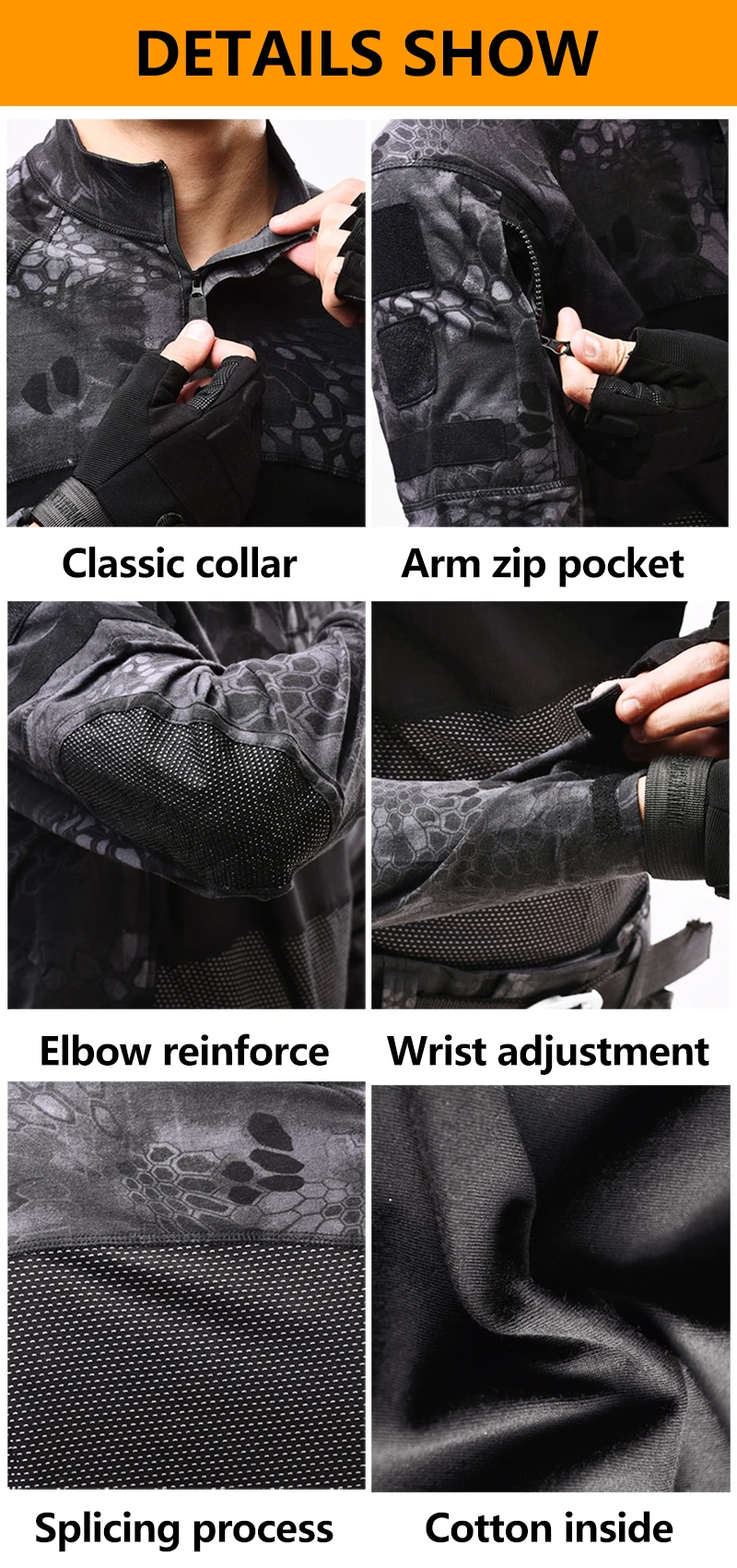 Características:1: Puños ajustables con cierre de gancho y bucle3: 2 bolsillos con cremallera en las mangas, con 1 bolsillo para lápiz en los brazos4: Tejido altamente elástico, súper suave/transpirable6: Tejido de secado rápido/fácil de lavar, sin decoloración.7: Tejido de codo de doble capa + partícula de silicona antideslizante8: Transpirable para la parte del cuerpo9: Costura doble, más fuerte