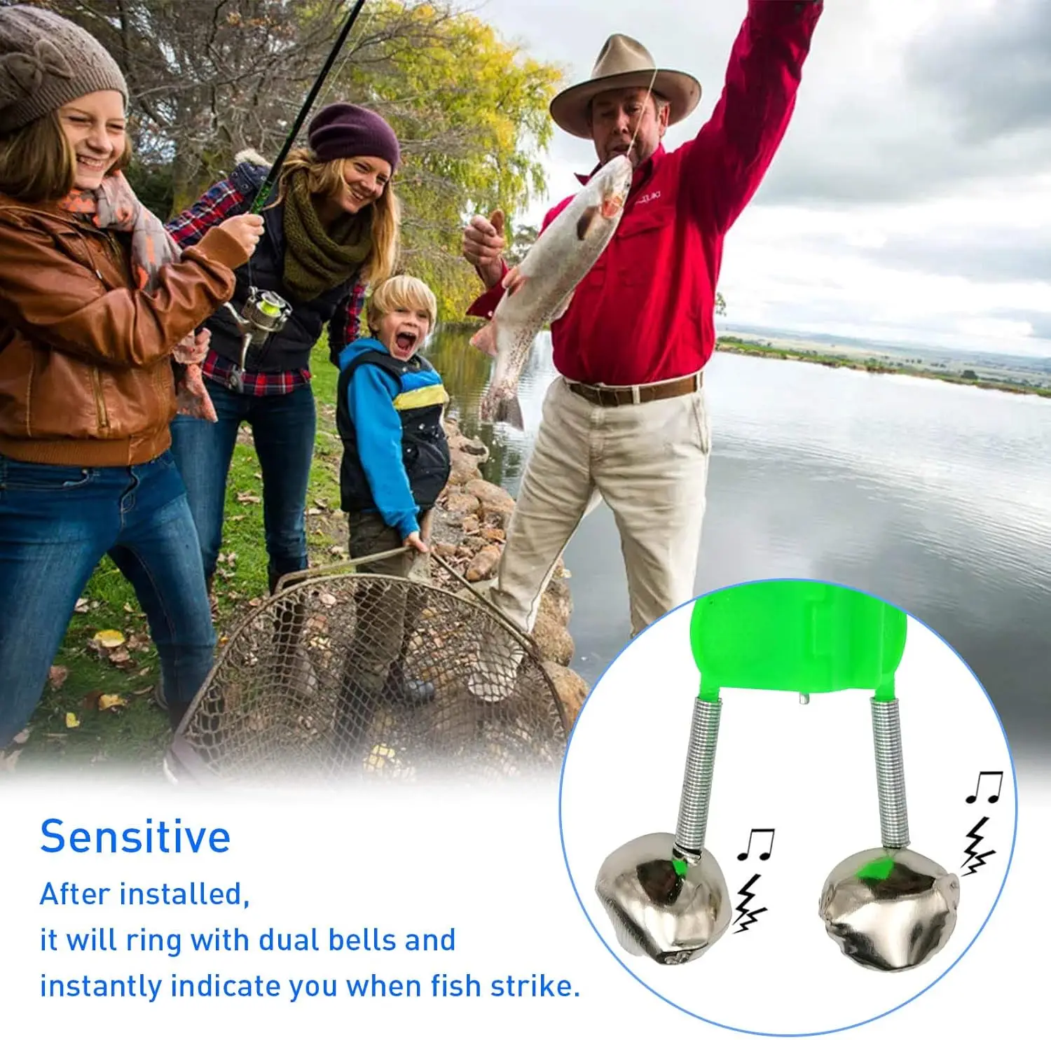 2.【Campana sensible】Simplemente sujete la campana a su caña de pescar. Una vez que un pez muerde el anzuelo, la campana de la alarma está conectada por un resorte preciso y sensible puede reaccionar rápidamente y enviar un sonido nítido para recordarle que el pez está tirando la varilla;Sólo necesitas ver qué luz indicadora tira de la varilla.