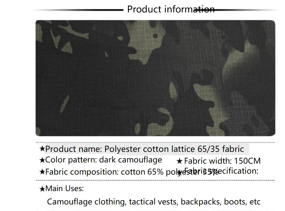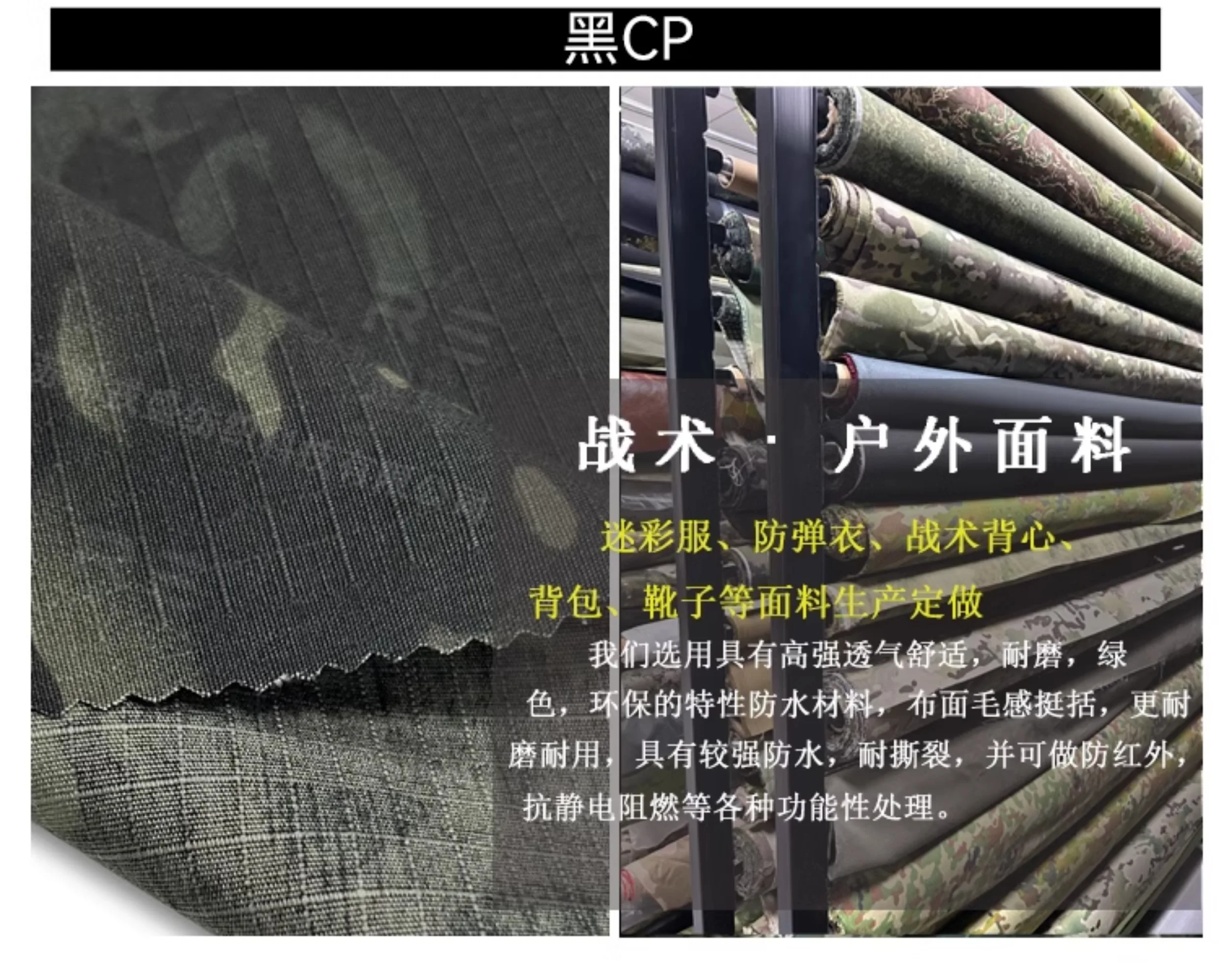 Usos principales: ropa de camuflaje, chaleco táctico, mochila, botas, etc.