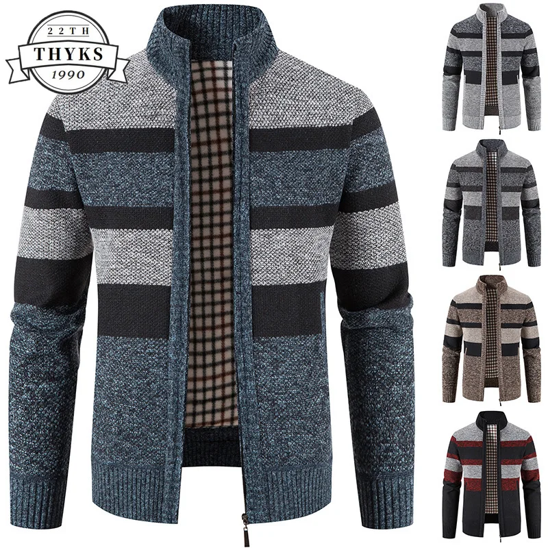 Cárdigan a rayas para hombre, chaqueta informal de retales, gruesa, cálida, de manga larga, medio cuello alto, suéteres de punto, abrigo, ropa masculina