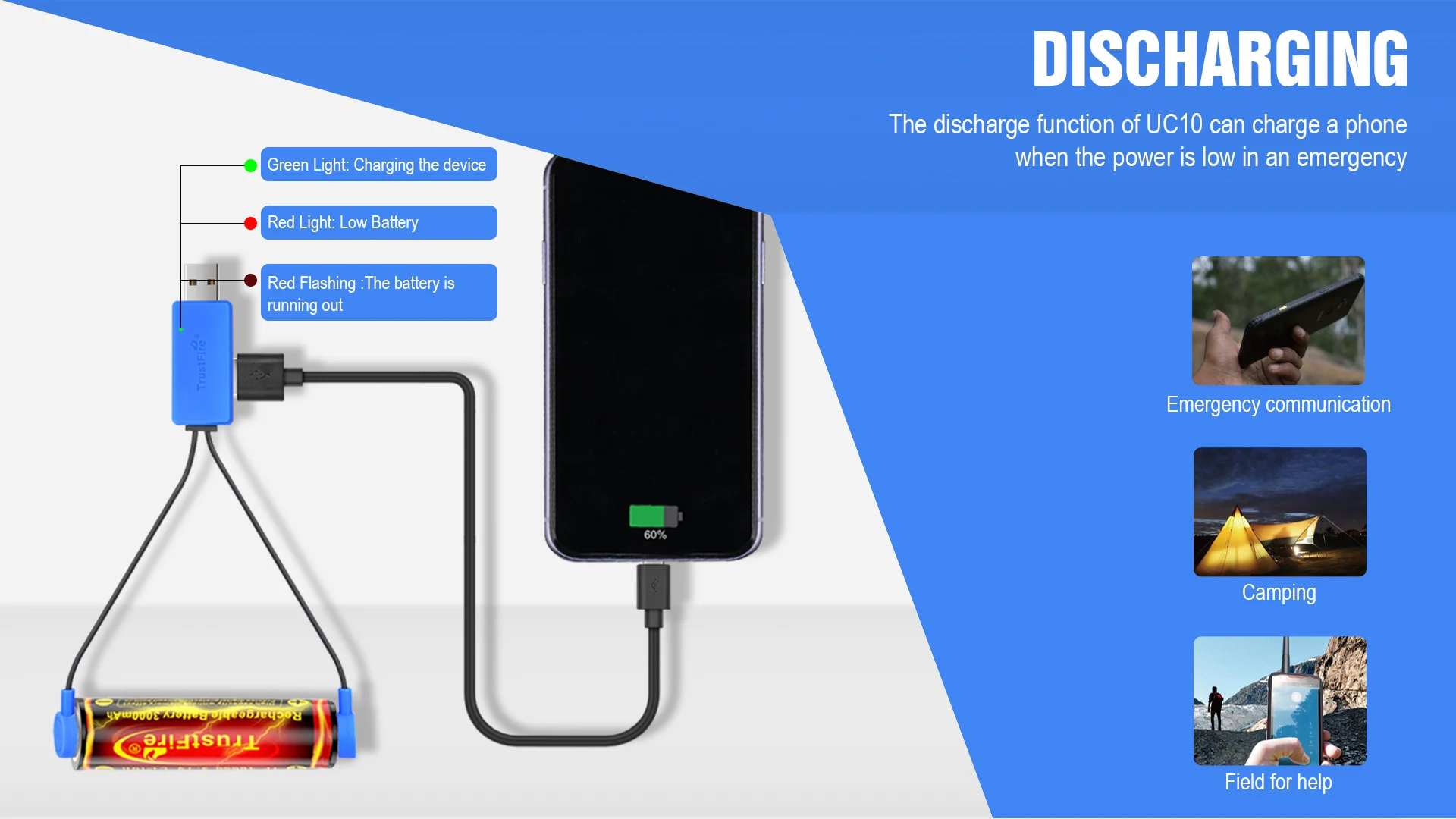 La función de descarga del UC10 puede cargar un teléfono cuando la energía es baja en caso de emergencia.